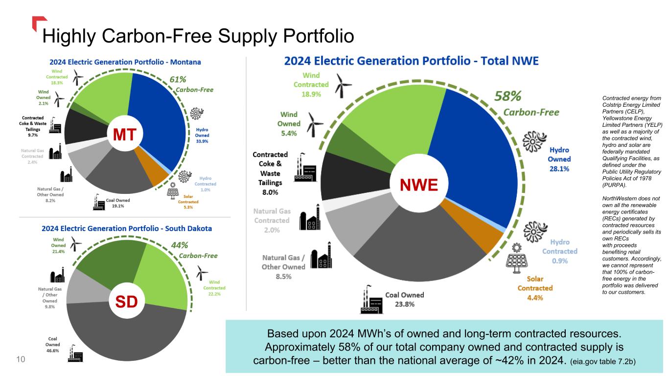 A Diversified Electric and Gas Utility 9 NorthWestern’s ‘80/20’ rules: Approximately 80% Electric and 80% Montana. Nearly $5.4 billion of rate base investment to serve our customers. Data as reported in our 2024 10-K