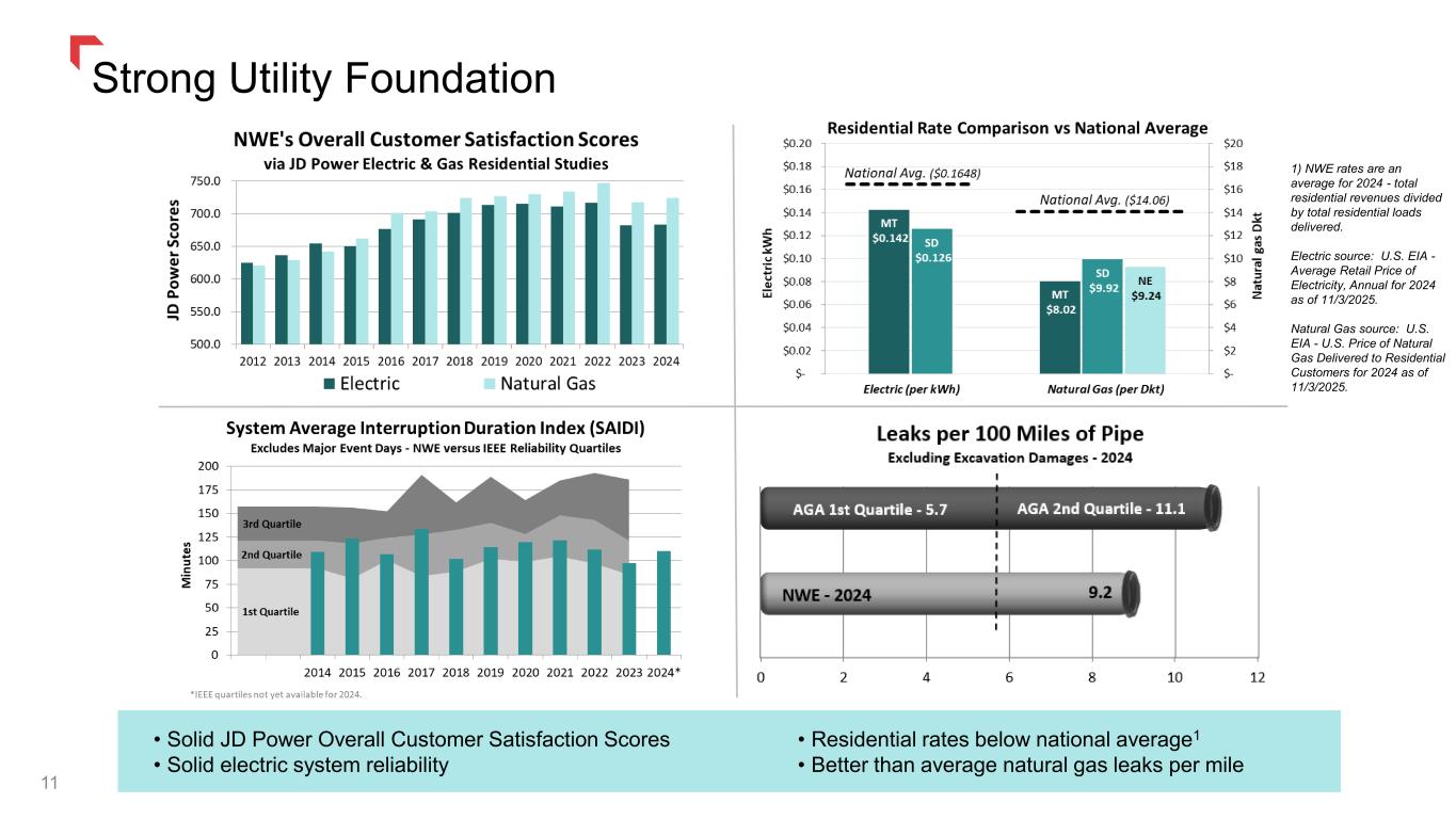 NWE SD Highly Carbon-Free Supply Portfolio Based upon 2024 MWh’s of owned and long-term contracted resources. Approximately 58% of our total company owned and contracted supply is carbon-free – better than the national average of ~42% in 2024. (eia.gov table 7.2b) Contracted energy from Colstrip Energy Limited Partners (CELP), Yellowstone Energy Limited Partners (YELP) as well as a majority of the contracted wind, hydro and solar are federally mandated Qualifying Facilities, as defined under the Public Utility Regulatory Policies Act of 1978 (PURPA). NorthWestern does not own all the renewable energy certificates (RECs) generated by contracted resources and periodically sells its own RECs with proceeds benefiting retail customers. Accordingly, we cannot represent that 100% of carbon- free energy in the portfolio was delivered to our customers. 10 MT