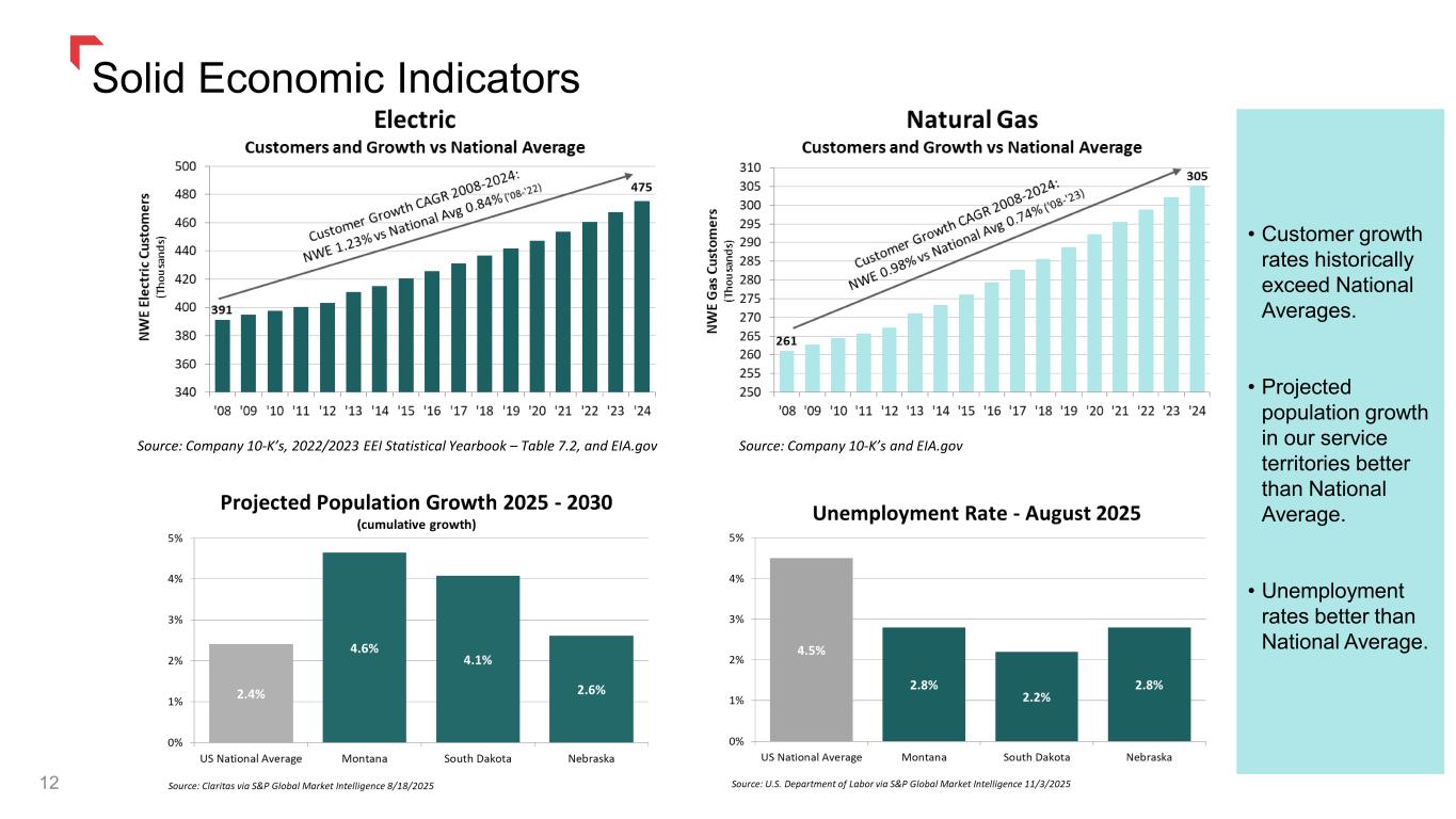 Strong Utility Foundation 11 • Solid JD Power Overall Customer Satisfaction Scores • Solid electric system reliability • Residential rates below national average1 • Better than average natural gas leaks per mile 1) NWE rates are an average for 2024 - total residential revenues divided by total residential loads delivered. Electric source: U.S. EIA - Average Retail Price of Electricity, Annual for 2024 as of 11/3/2025. Natural Gas source: U.S. EIA - U.S. Price of Natural Gas Delivered to Residential Customers for 2024 as of 11/3/2025.