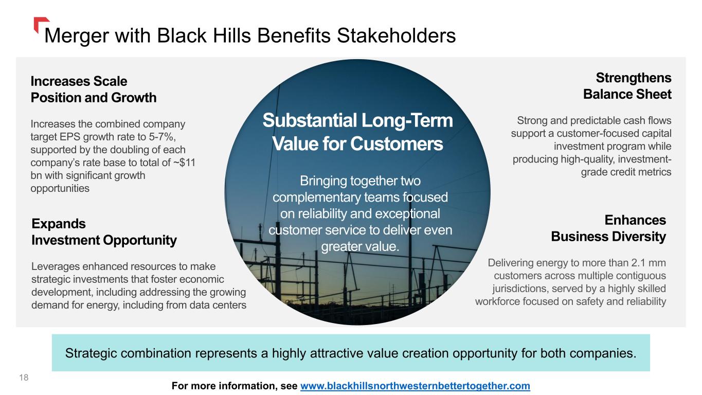 Merger with Black Hills Update 17 ✓ In October, filed joint applications for transaction approval with regulatory commissions in Montana, Nebraska, and South Dakota ✓ Expect to file a joint application with FERC during Q4 2025