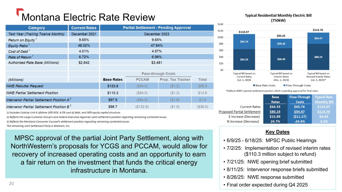 Credit, Cash Flow, and Financing Plans 19 FFO: Cash from Operations less Working Capital Adjustments. Debt: Long- & Short-term Debt (including unamortized debt issuance costs and pension liability). S&P upgraded outlook to Positive1, Moody’s and Fitch remain Stable. No equity expected to fund the current $2.74 billion 5-year capital plan. Financing plans (targeting a FFO to Debt ratio > 14%) are expected to maintain our current credit ratings. We expect to pay minimal cash taxes into 2028 due to utilization of our NOL’s and tax credits. Financing plans are subject to change. 1.) August 19, 2025. Positive Outlook for NorthWestern Energy Group and NorthWestern Corporation. NorthWestern Energy Public Service Corp. remains Stable Outlook.