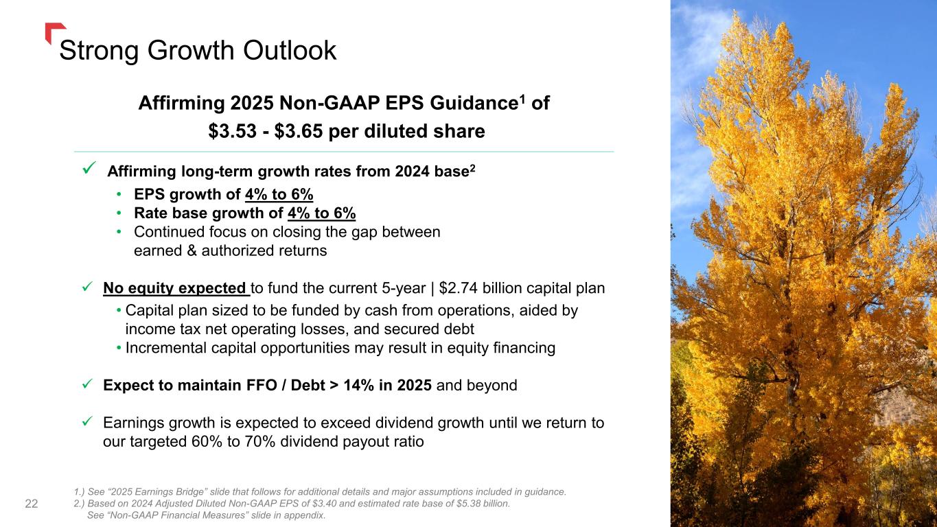 Key Dates • 6/9/25 - 6/18/25: MPSC Public Hearings • 7/2/25: Interim rates remain in place as implemented Dec. 1, 2024 ($17.4 million subject to refund) • 7/21/25: NWE opening brief submitted • 8/11/25: Intervenor response briefs submitted • 8/26/25: NWE response submitted • Final order expected during Q4 2025 MPSC approval of the Joint Party Settlement would allow for recovery of increased operating costs and an opportunity to earn a fair return on the investment that funds the critical energy infrastructure in Montana. 21 Montana Natural Gas Rate Review