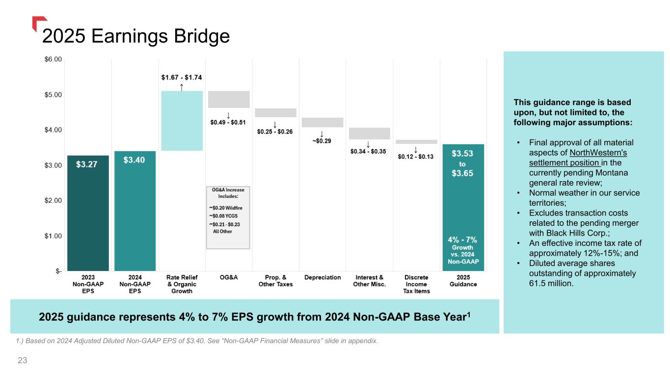22 Affirming 2025 Non-GAAP EPS Guidance1 of $3.53 - $3.65 per diluted share ✓ Affirming long-term growth rates from 2024 base2 • EPS growth of 4% to 6% • Rate base growth of 4% to 6% • Continued focus on closing the gap between earned & authorized returns ✓ No equity expected to fund the current 5-year | $2.74 billion capital plan • Capital plan sized to be funded by cash from operations, aided by income tax net operating losses, and secured debt • Incremental capital opportunities may result in equity financing ✓ Expect to maintain FFO / Debt > 14% in 2025 and beyond ✓ Earnings growth is expected to exceed dividend growth until we return to our targeted 60% to 70% dividend payout ratio 1.) See “2025 Earnings Bridge” slide that follows for additional details and major assumptions included in guidance. 2.) Based on 2024 Adjusted Diluted Non-GAAP EPS of $3.40 and estimated rate base of $5.38 billion. See “Non-GAAP Financial Measures” slide in appendix. Strong Growth Outlook