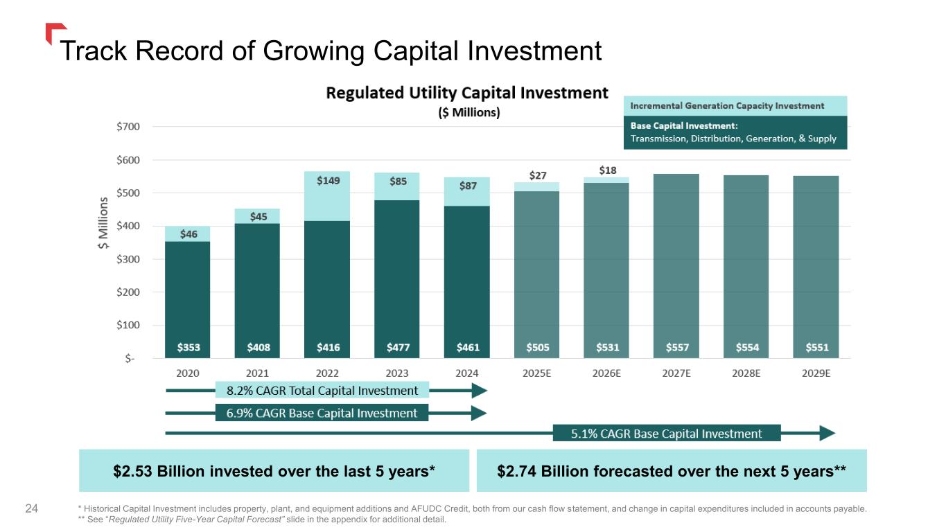 Track Record of Growing Capital Investment 24 * Historical Capital Investment includes property, plant, and equipment additions and AFUDC Credit, both from our cash flow statement, and change in capital expenditures included in accounts payable. ** See “Regulated Utility Five-Year Capital Forecast” slide in the appendix for additional detail. $2.53 Billion invested over the last 5 years* $2.74 Billion forecasted over the next 5 years**