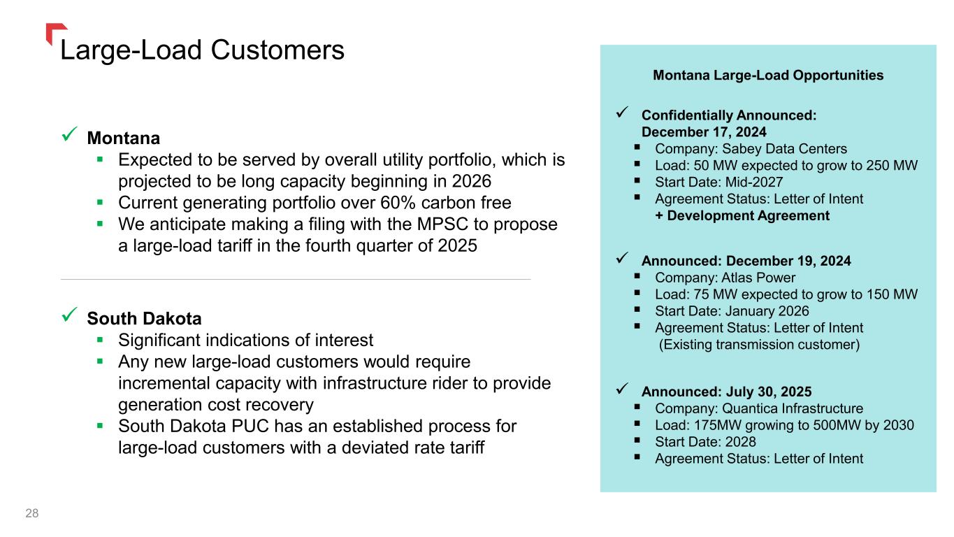 ✓ Montana ▪ Expected to be served by overall utility portfolio, which is projected to be long capacity beginning in 2026 ▪ Current generating portfolio over 60% carbon free ▪ We anticipate making a filing with the MPSC to propose a large-load tariff in the fourth quarter of 2025 ✓ South Dakota ▪ Significant indications of interest ▪ Any new large-load customers would require incremental capacity with infrastructure rider to provide generation cost recovery ▪ South Dakota PUC has an established process for large-load customers with a deviated rate tariff 28 Large-Load Customers Montana Large-Load Opportunities ✓ Confidentially Announced: December 17, 2024 ▪ Company: Sabey Data Centers ▪ Load: 50 MW expected to grow to 250 MW ▪ Start Date: Mid-2027 ▪ Agreement Status: Letter of Intent + Development Agreement ✓ Announced: December 19, 2024 ▪ Company: Atlas Power ▪ Load: 75 MW expected to grow to 150 MW ▪ Start Date: January 2026 ▪ Agreement Status: Letter of Intent (Existing transmission customer) ✓ Announced: July 30, 2025 ▪ Company: Quantica Infrastructure ▪ Load: 175MW growing to 500MW by 2030 ▪ Start Date: 2028 ▪ Agreement Status: Letter of Intent