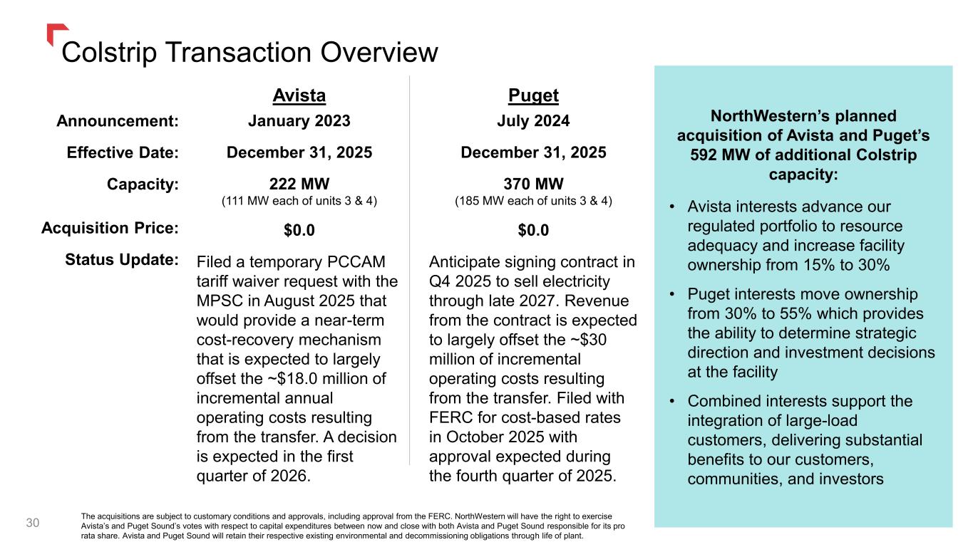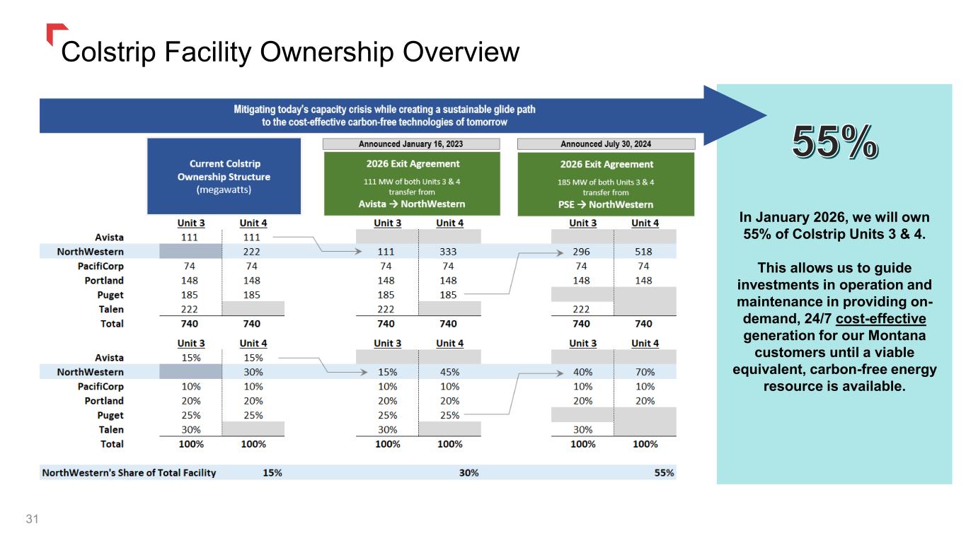 Colstrip Transaction Overview 30 Announcement: Effective Date: Capacity: Acquisition Price: Status Update: Puget July 2024 December 31, 2025 370 MW (185 MW each of units 3 & 4) $0.0 Anticipate signing contract in Q4 2025 to sell electricity through late 2027. Revenue from the contract is expected to largely offset the ~$30 million of incremental operating costs resulting from the transfer. Filed with FERC for cost-based rates in October 2025 with approval expected during the fourth quarter of 2025. Avista January 2023 December 31, 2025 222 MW (111 MW each of units 3 & 4) $0.0 Filed a temporary PCCAM tariff waiver request with the MPSC in August 2025 that would provide a near-term cost-recovery mechanism that is expected to largely offset the ~$18.0 million of incremental annual operating costs resulting from the transfer. A decision is expected in the first quarter of 2026. NorthWestern’s planned acquisition of Avista and Puget’s 592 MW of additional Colstrip capacity: • Avista interests advance our regulated portfolio to resource adequacy and increase facility ownership from 15% to 30% • Puget interests move ownership from 30% to 55% which provides the ability to determine strategic direction and investment decisions at the facility • Combined interests support the integration of large-load customers, delivering substantial benefits to our customers, communities, and investors The acquisitions are subject to customary conditions and approvals, including approval from the FERC. NorthWestern will have the right to exercise Avista’s and Puget Sound’s votes with respect to capital expenditures between now and close with both Avista and Puget Sound responsible for its pro rata share. Avista and Puget Sound will retain their respective existing environmental and decommissioning obligations through life of plant.