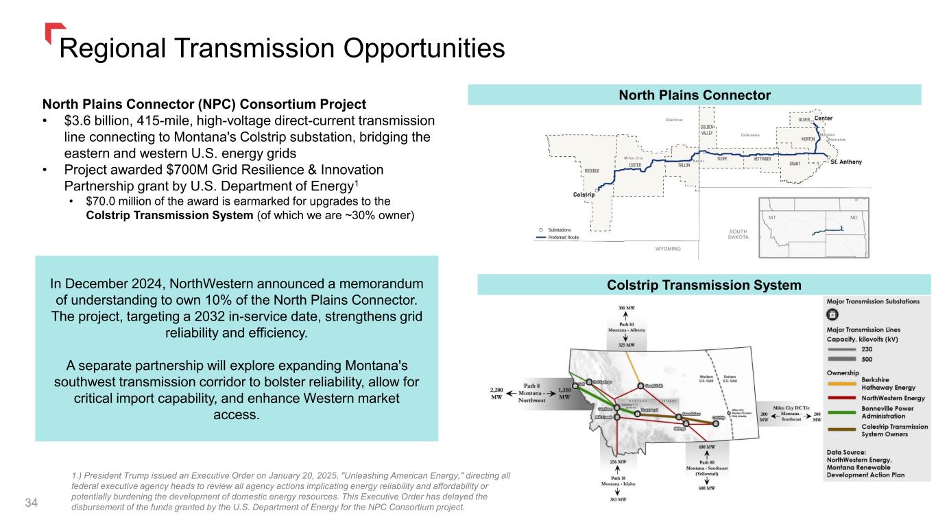 33 Transmission Bill Allows Certificate of Public Convenience & Necessity (CPCN) for electric transmission to be issued by the Montana Public Service Commission (MPSC) • Greater confidence of fair and equitable return Bill allows greater confidence for investors providing the critical capital necessary for the continued modernization of the energy grid • Approvals MPSC shall determine within 300 days of application if transmission projects (greater than 69 kV) are in public interest and may grant or deny a CPCN • Cost clarity post CPCN Within 90 days of application, the MPSC shall issue an order responding to a utilities request for advanced approval of prudent cost recovery SB 301 was also passed by the Montana Legislature with unanimous bipartisan support and signed into law.