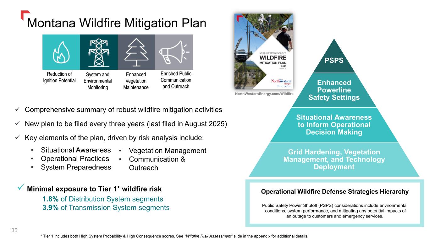 34 Regional Transmission Opportunities Colstrip Transmission System North Plains Connector (NPC) Consortium Project • $3.6 billion, 415-mile, high-voltage direct-current transmission line connecting to Montana's Colstrip substation, bridging the eastern and western U.S. energy grids • Project awarded $700M Grid Resilience & Innovation Partnership grant by U.S. Department of Energy1 • $70.0 million of the award is earmarked for upgrades to the Colstrip Transmission System (of which we are ~30% owner) North Plains Connector In December 2024, NorthWestern announced a memorandum of understanding to own 10% of the North Plains Connector. The project, targeting a 2032 in-service date, strengthens grid reliability and efficiency. A separate partnership will explore expanding Montana's southwest transmission corridor to bolster reliability, allow for critical import capability, and enhance Western market access. 1.) President Trump issued an Executive Order on January 20, 2025, "Unleashing American Energy," directing all federal executive agency heads to review all agency actions implicating energy reliability and affordability or potentially burdening the development of domestic energy resources. This Executive Order has delayed the disbursement of the funds granted by the U.S. Department of Energy for the NPC Consortium project.