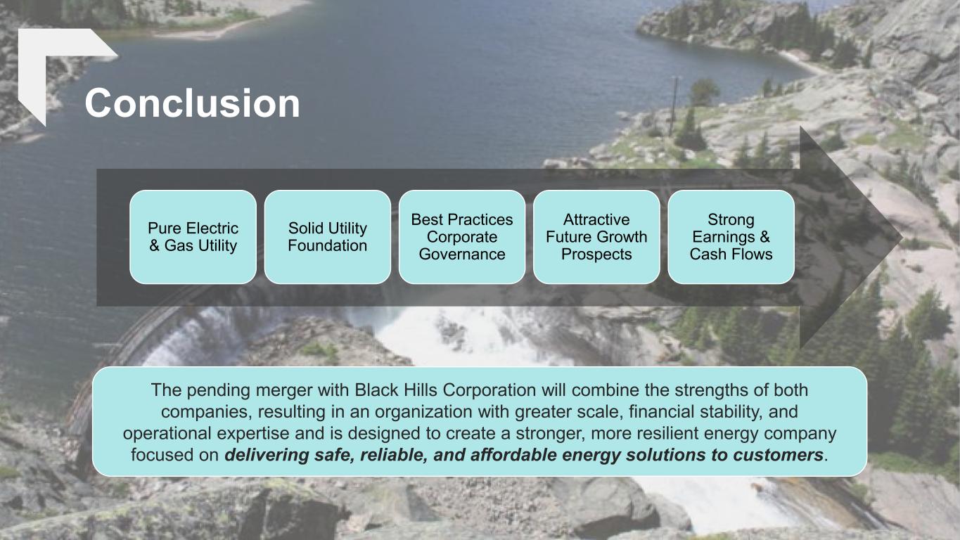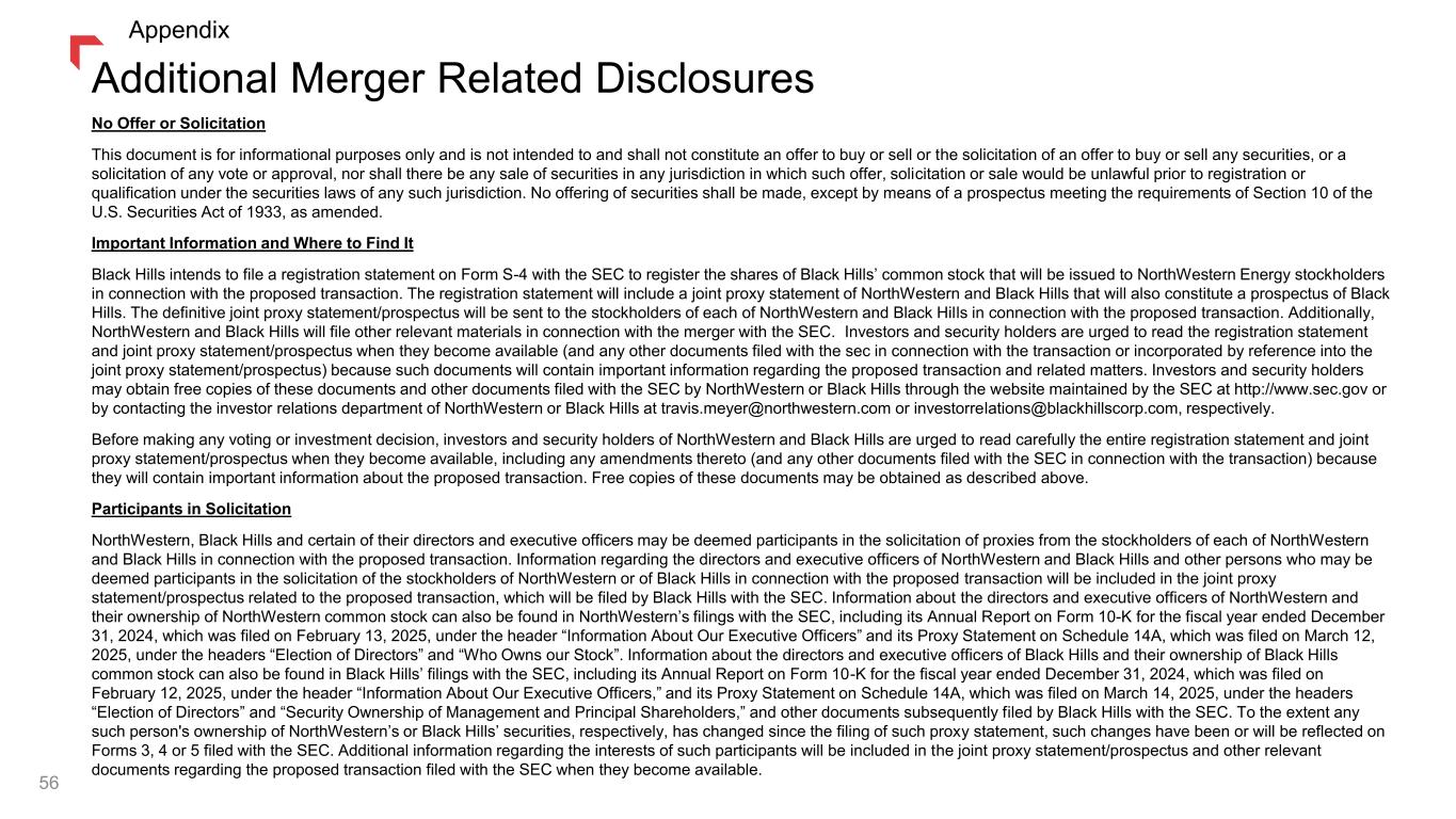 Additional Merger Related Disclosures 56 Appendix No Offer or Solicitation This document is for informational purposes only and is not intended to and shall not constitute an offer to buy or sell or the solicitation of an offer to buy or sell any securities, or a solicitation of any vote or approval, nor shall there be any sale of securities in any jurisdiction in which such offer, solicitation or sale would be unlawful prior to registration or qualification under the securities laws of any such jurisdiction. No offering of securities shall be made, except by means of a prospectus meeting the requirements of Section 10 of the U.S. Securities Act of 1933, as amended. Important Information and Where to Find It Black Hills intends to file a registration statement on Form S-4 with the SEC to register the shares of Black Hills’ common stock that will be issued to NorthWestern Energy stockholders in connection with the proposed transaction. The registration statement will include a joint proxy statement of NorthWestern and Black Hills that will also constitute a prospectus of Black Hills. The definitive joint proxy statement/prospectus will be sent to the stockholders of each of NorthWestern and Black Hills in connection with the proposed transaction. Additionally, NorthWestern and Black Hills will file other relevant materials in connection with the merger with the SEC. Investors and security holders are urged to read the registration statement and joint proxy statement/prospectus when they become available (and any other documents filed with the sec in connection with the transaction or incorporated by reference into the joint proxy statement/prospectus) because such documents will contain important information regarding the proposed transaction and related matters. Investors and security holders may obtain free copies of these documents and other documents filed with the SEC by NorthWestern or Black Hills through the website maintained by the SEC at http://www.sec.gov or by contacting the investor relations department of NorthWestern or Black Hills at travis.meyer@northwestern.com or investorrelations@blackhillscorp.com, respectively. Before making any voting or investment decision, investors and security holders of NorthWestern and Black Hills are urged to read carefully the entire registration statement and joint proxy statement/prospectus when they become available, including any amendments thereto (and any other documents filed with the SEC in connection with the transaction) because they will contain important information about the proposed transaction. Free copies of these documents may be obtained as described above. Participants in Solicitation NorthWestern, Black Hills and certain of their directors and executive officers may be deemed participants in the solicitation of proxies from the stockholders of each of NorthWestern and Black Hills in connection with the proposed transaction. Information regarding the directors and executive officers of NorthWestern and Black Hills and other persons who may be deemed participants in the solicitation of the stockholders of NorthWestern or of Black Hills in connection with the proposed transaction will be included in the joint proxy statement/prospectus related to the proposed transaction, which will be filed by Black Hills with the SEC. Information about the directors and executive officers of NorthWestern and their ownership of NorthWestern common stock can also be found in NorthWestern’s filings with the SEC, including its Annual Report on Form 10-K for the fiscal year ended December 31, 2024, which was filed on February 13, 2025, under the header “Information About Our Executive Officers” and its Proxy Statement on Schedule 14A, which was filed on March 12, 2025, under the headers “Election of Directors” and “Who Owns our Stock”. Information about the directors and executive officers of Black Hills and their ownership of Black Hills common stock can also be found in Black Hills’ filings with the SEC, including its Annual Report on Form 10-K for the fiscal year ended December 31, 2024, which was filed on February 12, 2025, under the header “Information About Our Executive Officers,” and its Proxy Statement on Schedule 14A, which was filed on March 14, 2025, under the headers “Election of Directors” and “Security Ownership of Management and Principal Shareholders,” and other documents subsequently filed by Black Hills with the SEC. To the extent any such person's ownership of NorthWestern’s or Black Hills’ securities, respectively, has changed since the filing of such proxy statement, such changes have been or will be reflected on Forms 3, 4 or 5 filed with the SEC. Additional information regarding the interests of such participants will be included in the joint proxy statement/prospectus and other relevant documents regarding the proposed transaction filed with the SEC when they become available.