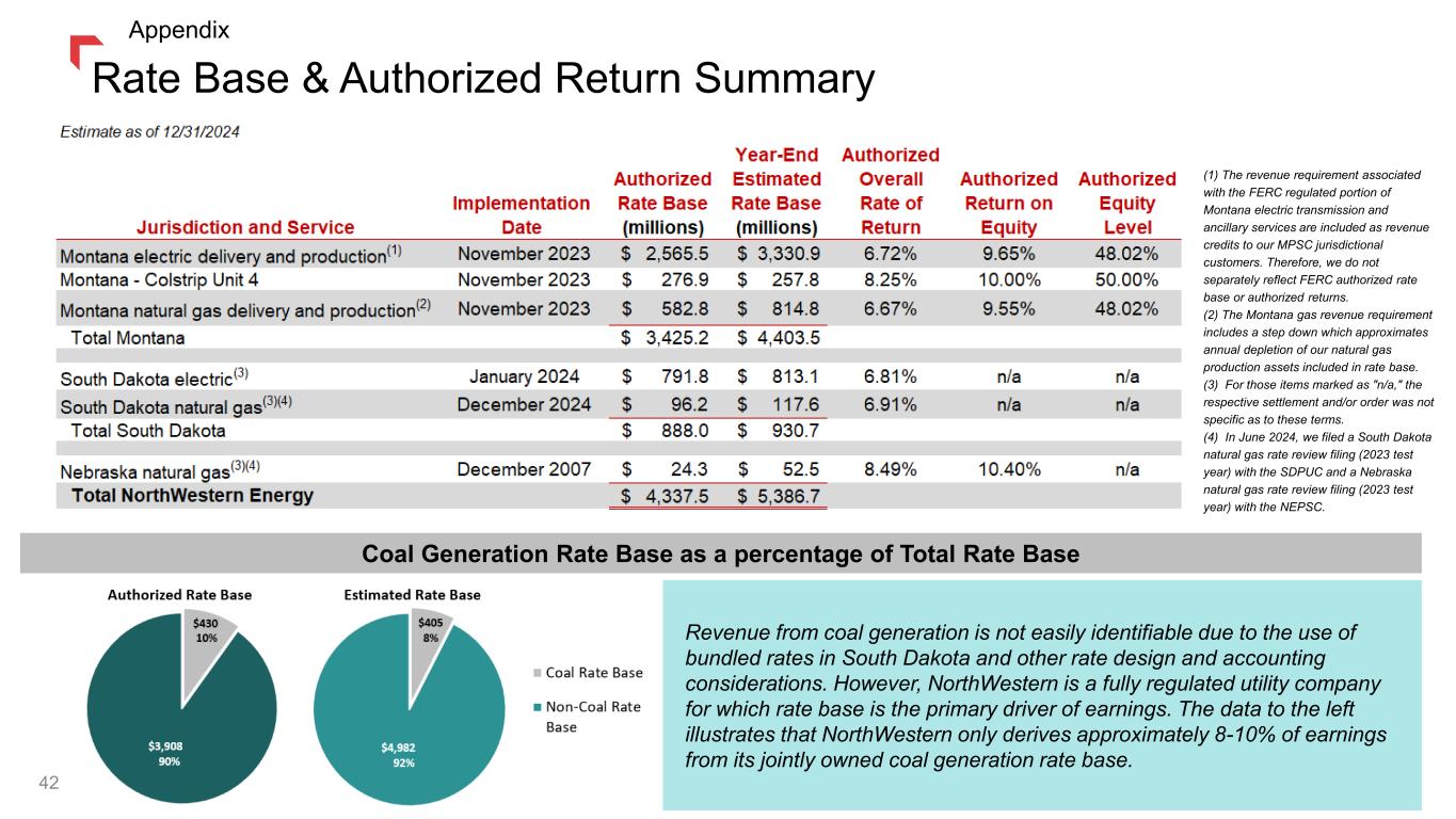 (1) The revenue requirement associated with the FERC regulated portion of Montana electric transmission and ancillary services are included as revenue credits to our MPSC jurisdictional customers. Therefore, we do not separately reflect FERC authorized rate base or authorized returns. (2) The Montana gas revenue requirement includes a step down which approximates annual depletion of our natural gas production assets included in rate base. (3) For those items marked as "n/a," the respective settlement and/or order was not specific as to these terms. (4) In June 2024, we filed a South Dakota natural gas rate review filing (2023 test year) with the SDPUC and a Nebraska natural gas rate review filing (2023 test year) with the NEPSC. Coal Generation Rate Base as a percentage of Total Rate Base Revenue from coal generation is not easily identifiable due to the use of bundled rates in South Dakota and other rate design and accounting considerations. However, NorthWestern is a fully regulated utility company for which rate base is the primary driver of earnings. The data to the left illustrates that NorthWestern only derives approximately 8-10% of earnings from its jointly owned coal generation rate base. Rate Base & Authorized Return Summary Appendix 42