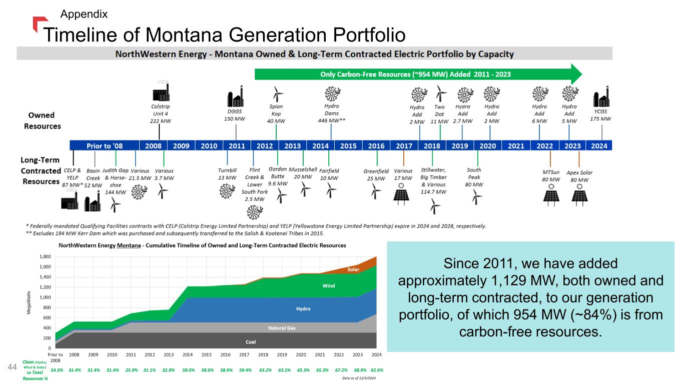 Timeline of Montana Generation Portfolio Since 2011, we have added approximately 1,129 MW, both owned and long-term contracted, to our generation portfolio, of which 954 MW (~84%) is from carbon-free resources. Appendix 44