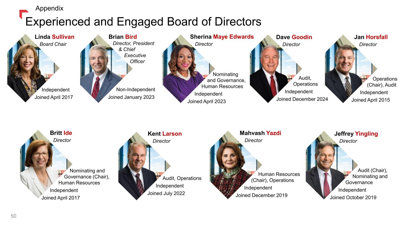 Experienced and Engaged Board of Directors 50 Linda Sullivan Board Chair Dave Goodin Director Sherina Maye Edwards Director Brian Bird Director, President & Chief Executive Officer Britt Ide Director Kent Larson Director Mahvash Yazdi Director Jeffrey Yingling Director Human Resources (Chair), Operations Independent Joined December 2019 Independent Joined April 2017 Non-Independent Joined January 2023 Nominating and Governance, Human Resources Independent Joined April 2023 Audit, Operations Independent Joined December 2024 Audit, Operations Independent Joined July 2022 Jan Horsfall Director Operations (Chair), Audit Independent Joined April 2015 Audit (Chair), Nominating and Governance Independent Joined October 2019 Nominating and Governance (Chair), Human Resources Independent Joined April 2017 Appendix