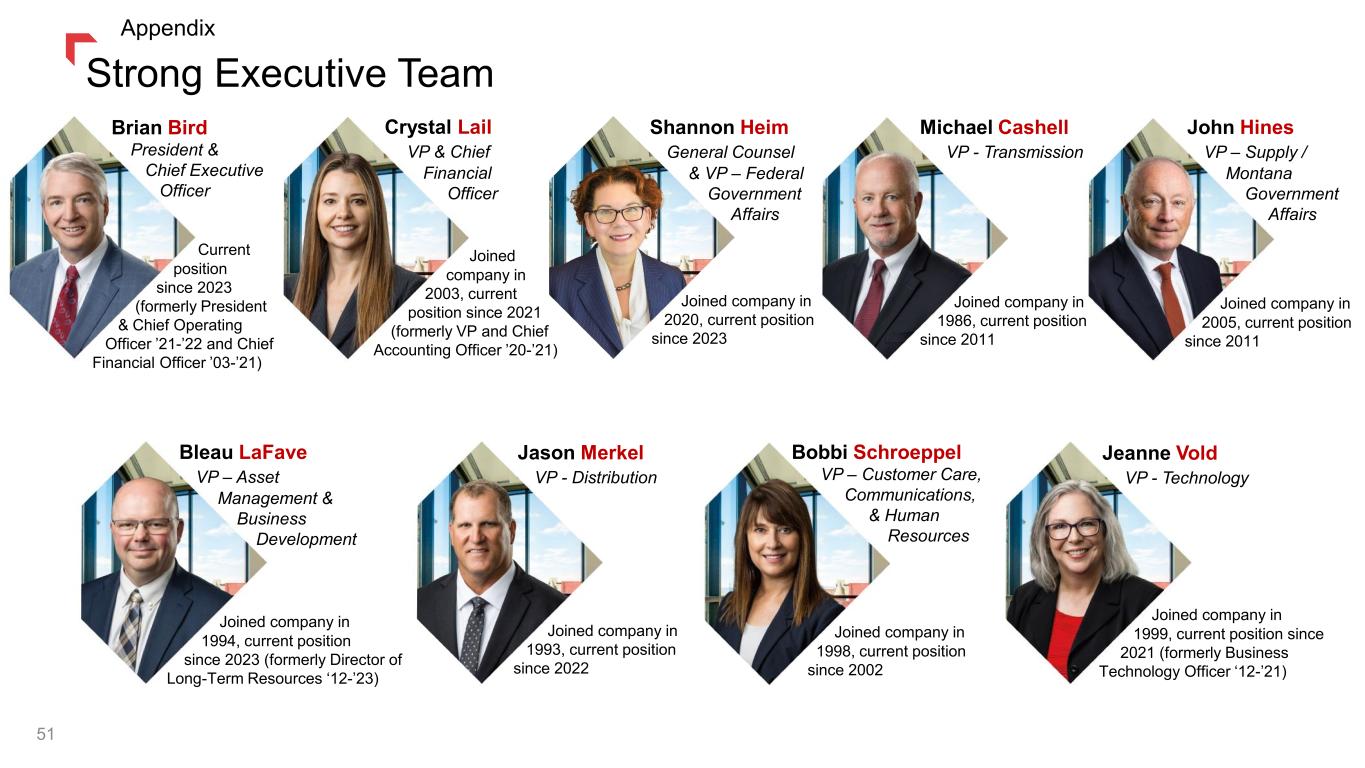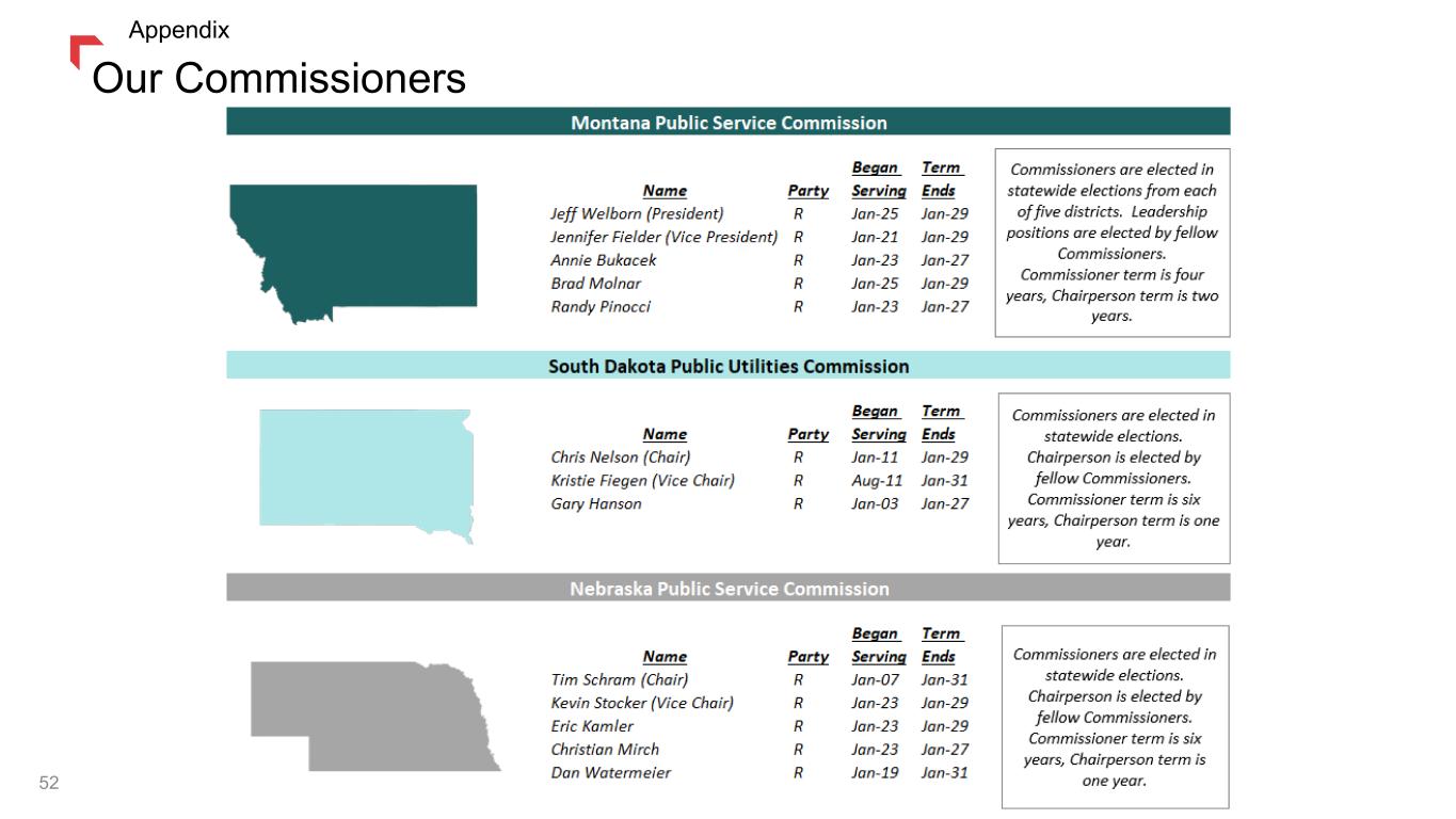 Strong Executive Team 51 Crystal Lail VP & Chief Financial Officer Michael Cashell VP - Transmission Shannon Heim General Counsel & VP – Federal Government Affairs Brian Bird President & Chief Executive Officer Bleau LaFave VP – Asset Management & Business Development Jason Merkel VP - Distribution Bobbi Schroeppel VP – Customer Care, Communications, & Human Resources Jeanne Vold VP - Technology Joined company in 2020, current position since 2023 Joined company in 2003, current position since 2021 (formerly VP and Chief Accounting Officer ’20-’21) Joined company in 1986, current position since 2011 Current position since 2023 (formerly President & Chief Operating Officer ’21-’22 and Chief Financial Officer ’03-’21) Joined company in 1993, current position since 2022 John Hines VP – Supply / Montana Government Affairs Joined company in 2005, current position since 2011 Joined company in 1994, current position since 2023 (formerly Director of Long-Term Resources ‘12-’23) Joined company in 1998, current position since 2002 Joined company in 1999, current position since 2021 (formerly Business Technology Officer ‘12-’21) Appendix