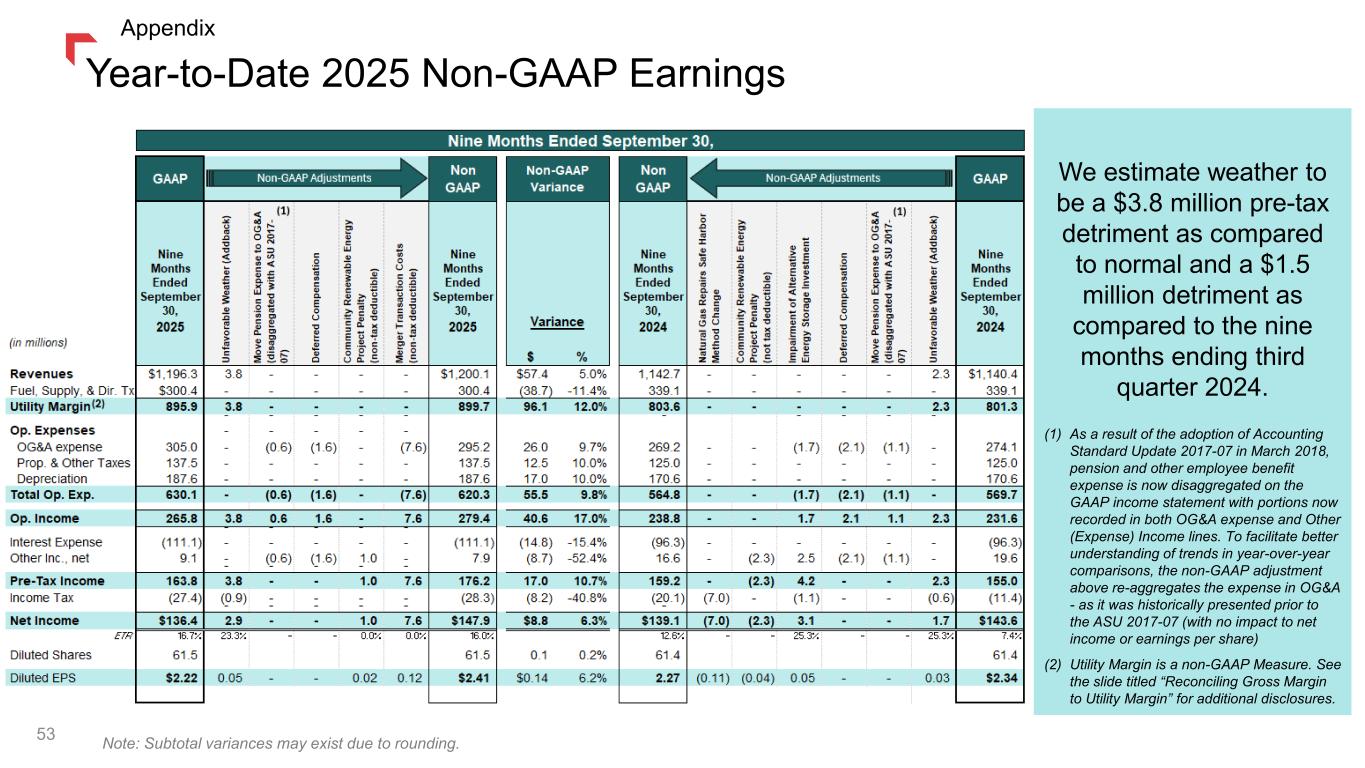We estimate weather to be a $3.8 million pre-tax detriment as compared to normal and a $1.5 million detriment as compared to the nine months ending third quarter 2024. (1) As a result of the adoption of Accounting Standard Update 2017-07 in March 2018, pension and other employee benefit expense is now disaggregated on the GAAP income statement with portions now recorded in both OG&A expense and Other (Expense) Income lines. To facilitate better understanding of trends in year-over-year comparisons, the non-GAAP adjustment above re-aggregates the expense in OG&A - as it was historically presented prior to the ASU 2017-07 (with no impact to net income or earnings per share) (2) Utility Margin is a non-GAAP Measure. See the slide titled “Reconciling Gross Margin to Utility Margin” for additional disclosures. Year-to-Date 2025 Non-GAAP Earnings 53 Note: Subtotal variances may exist due to rounding. Appendix