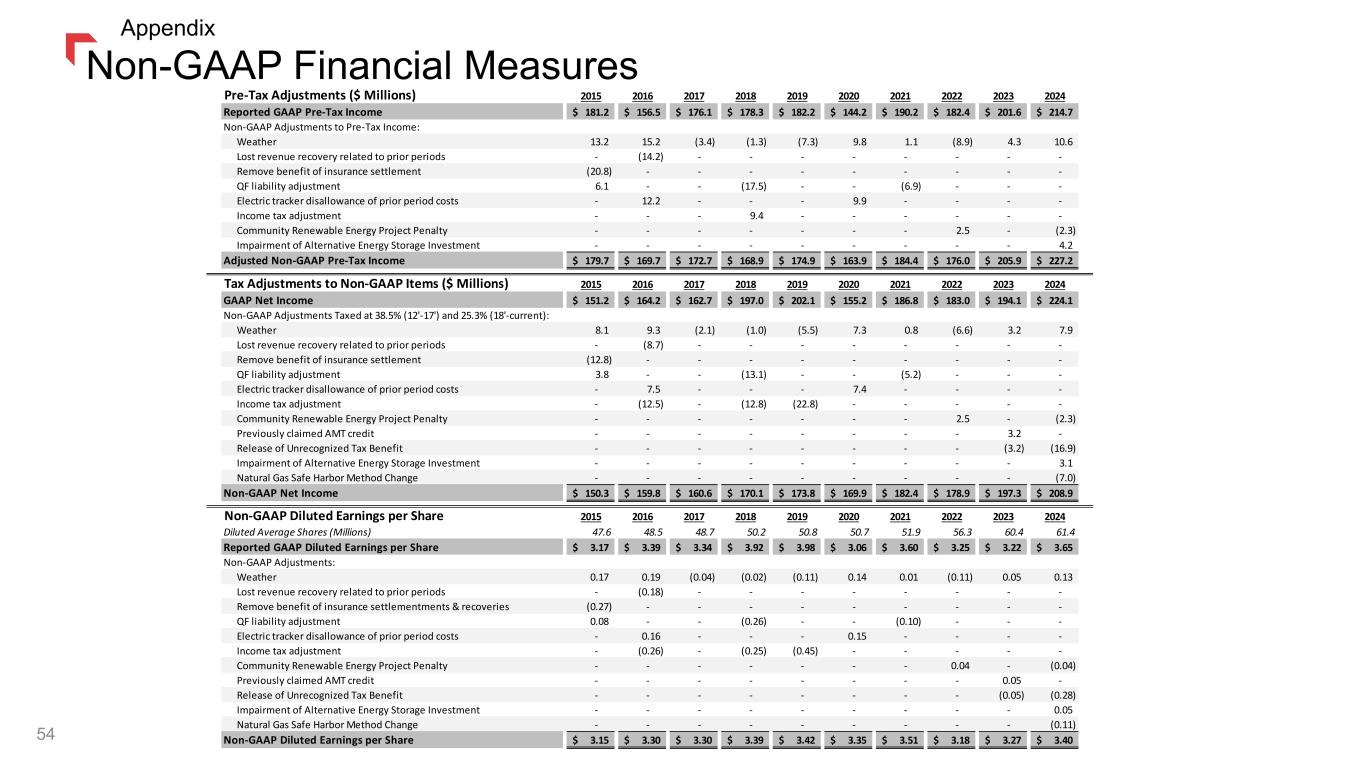 Non-GAAP Financial Measures 54 Appendix Pre-Tax Adjustments ($ Millions) 2015 2016 2017 2018 2019 2020 2021 2022 2023 2024 Reported GAAP Pre-Tax Income 181.2$ 156.5$ 176.1$ 178.3$ 182.2$ 144.2$ 190.2$ 182.4$ 201.6$ 214.7$ Non-GAAP Adjustments to Pre-Tax Income: Weather 13.2 15.2 (3.4) (1.3) (7.3) 9.8 1.1 (8.9) 4.3 10.6 Lost revenue recovery related to prior periods - (14.2) - - - - - - - - Remove benefit of insurance settlement (20.8) - - - - - - - - - QF liability adjustment 6.1 - - (17.5) - - (6.9) - - - Electric tracker disallowance of prior period costs - 12.2 - - - 9.9 - - - - Income tax adjustment - - - 9.4 - - - - - - Community Renewable Energy Project Penalty - - - - - - - 2.5 - (2.3) Impairment of Alternative Energy Storage Investment - - - - - - - - - 4.2 Adjusted Non-GAAP Pre-Tax Income 179.7$ 169.7$ 172.7$ 168.9$ 174.9$ 163.9$ 184.4$ 176.0$ 205.9$ 227.2$ Tax Adjustments to Non-GAAP Items ($ Millions) 2015 2016 2017 2018 2019 2020 2021 2022 2023 2024 GAAP Net Income 151.2$ 164.2$ 162.7$ 197.0$ 202.1$ 155.2$ 186.8$ 183.0$ 194.1$ 224.1$ Non-GAAP Adjustments Taxed at 38.5% (12'-17') and 25.3% (18'-current): Weather 8.1 9.3 (2.1) (1.0) (5.5) 7.3 0.8 (6.6) 3.2 7.9 Lost revenue recovery related to prior periods - (8.7) - - - - - - - - Remove benefit of insurance settlement (12.8) - - - - - - - - - QF liability adjustment 3.8 - - (13.1) - - (5.2) - - - Electric tracker disallowance of prior period costs - 7.5 - - - 7.4 - - - - Income tax adjustment - (12.5) - (12.8) (22.8) - - - - - Community Renewable Energy Project Penalty - - - - - - - 2.5 - (2.3) Previously claimed AMT credit - - - - - - - - 3.2 - Release of Unrecognized Tax Benefit - - - - - - - - (3.2) (16.9) Impairment of Alternative Energy Storage Investment - - - - - - - - - 3.1 Natural Gas Safe Harbor Method Change - - - - - - - - - (7.0) Non-GAAP Net Income 150.3$ 159.8$ 160.6$ 170.1$ 173.8$ 169.9$ 182.4$ 178.9$ 197.3$ 208.9$ Non-GAAP Diluted Earnings per Share 2015 2016 2017 2018 2019 2020 2021 2022 2023 2024 Diluted Average Shares (Millions) 47.6 48.5 48.7 50.2 50.8 50.7 51.9 56.3 60.4 61.4 Reported GAAP Diluted Earnings per Share 3.17$ 3.39$ 3.34$ 3.92$ 3.98$ 3.06$ 3.60$ 3.25$ 3.22$ 3.65$ Non-GAAP Adjustments: Weather 0.17 0.19 (0.04) (0.02) (0.11) 0.14 0.01 (0.11) 0.05 0.13 Lost revenue recovery related to prior periods - (0.18) - - - - - - - - Remove benefit of insurance settlementments & recoveries (0.27) - - - - - - - - - QF liability adjustment 0.08 - - (0.26) - - (0.10) - - - Electric tracker disallowance of prior period costs - 0.16 - - - 0.15 - - - - Income tax adjustment - (0.26) - (0.25) (0.45) - - - - - Community Renewable Energy Project Penalty - - - - - - - 0.04 - (0.04) Previously claimed AMT credit - - - - - - - - 0.05 - Release of Unrecognized Tax Benefit - - - - - - - - (0.05) (0.28) Impairment of Alternative Energy Storage Investment - - - - - - - - - 0.05 Natural Gas Safe Harbor Method Change - - - - - - - - - (0.11) Non-GAAP Diluted Earnings per Share 3.15$ 3.30$ 3.30$ 3.39$ 3.42$ 3.35$ 3.51$ 3.18$ 3.27$ 3.40$