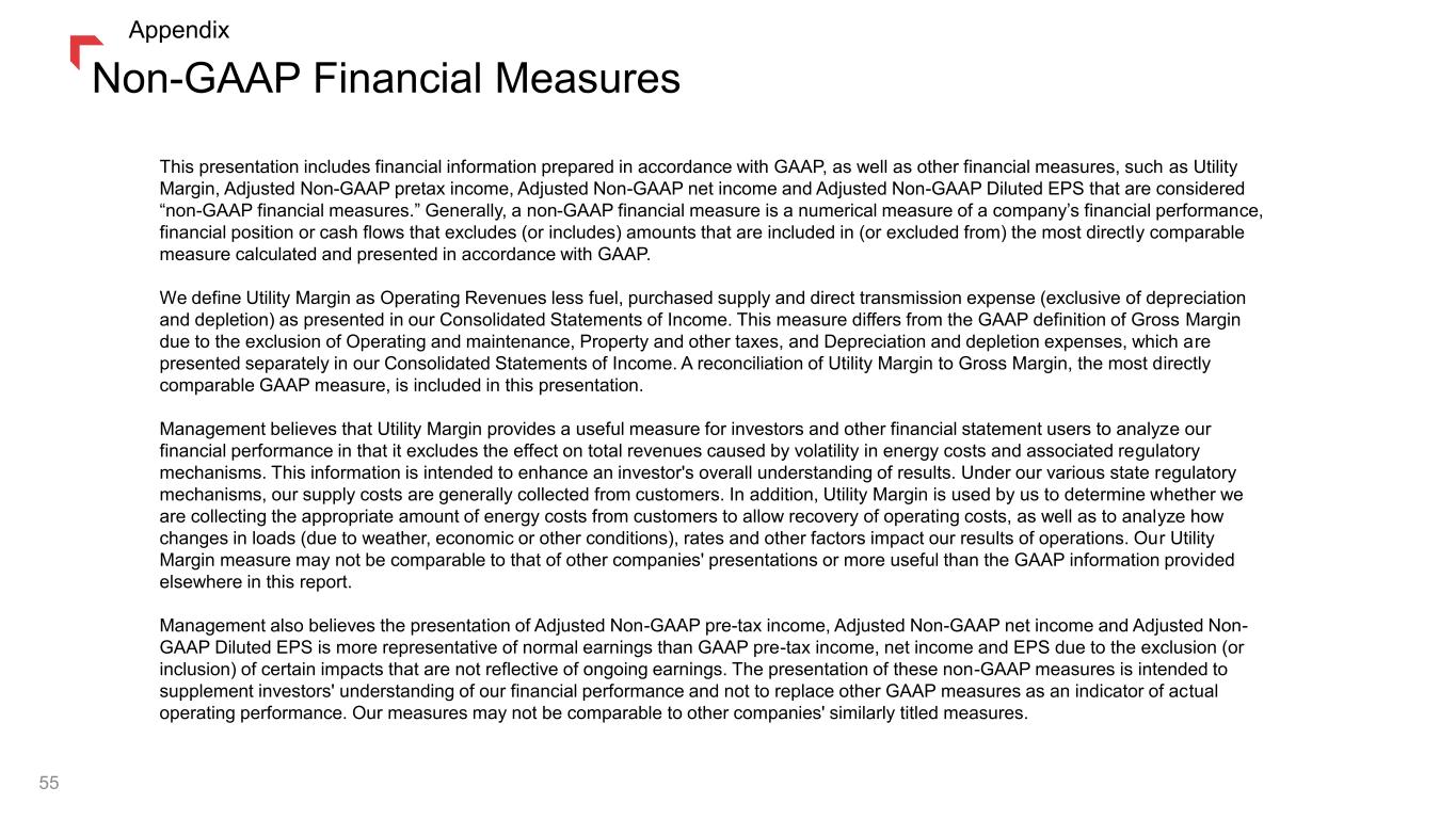 Non-GAAP Financial Measures This presentation includes financial information prepared in accordance with GAAP, as well as other financial measures, such as Utility Margin, Adjusted Non-GAAP pretax income, Adjusted Non-GAAP net income and Adjusted Non-GAAP Diluted EPS that are considered “non-GAAP financial measures.” Generally, a non-GAAP financial measure is a numerical measure of a company’s financial performance, financial position or cash flows that excludes (or includes) amounts that are included in (or excluded from) the most directly comparable measure calculated and presented in accordance with GAAP. We define Utility Margin as Operating Revenues less fuel, purchased supply and direct transmission expense (exclusive of depreciation and depletion) as presented in our Consolidated Statements of Income. This measure differs from the GAAP definition of Gross Margin due to the exclusion of Operating and maintenance, Property and other taxes, and Depreciation and depletion expenses, which are presented separately in our Consolidated Statements of Income. A reconciliation of Utility Margin to Gross Margin, the most directly comparable GAAP measure, is included in this presentation. Management believes that Utility Margin provides a useful measure for investors and other financial statement users to analyze our financial performance in that it excludes the effect on total revenues caused by volatility in energy costs and associated regulatory mechanisms. This information is intended to enhance an investor's overall understanding of results. Under our various state regulatory mechanisms, our supply costs are generally collected from customers. In addition, Utility Margin is used by us to determine whether we are collecting the appropriate amount of energy costs from customers to allow recovery of operating costs, as well as to analyze how changes in loads (due to weather, economic or other conditions), rates and other factors impact our results of operations. Our Utility Margin measure may not be comparable to that of other companies' presentations or more useful than the GAAP information provided elsewhere in this report. Management also believes the presentation of Adjusted Non-GAAP pre-tax income, Adjusted Non-GAAP net income and Adjusted Non- GAAP Diluted EPS is more representative of normal earnings than GAAP pre-tax income, net income and EPS due to the exclusion (or inclusion) of certain impacts that are not reflective of ongoing earnings. The presentation of these non-GAAP measures is intended to supplement investors' understanding of our financial performance and not to replace other GAAP measures as an indicator of actual operating performance. Our measures may not be comparable to other companies' similarly titled measures. 55 Appendix