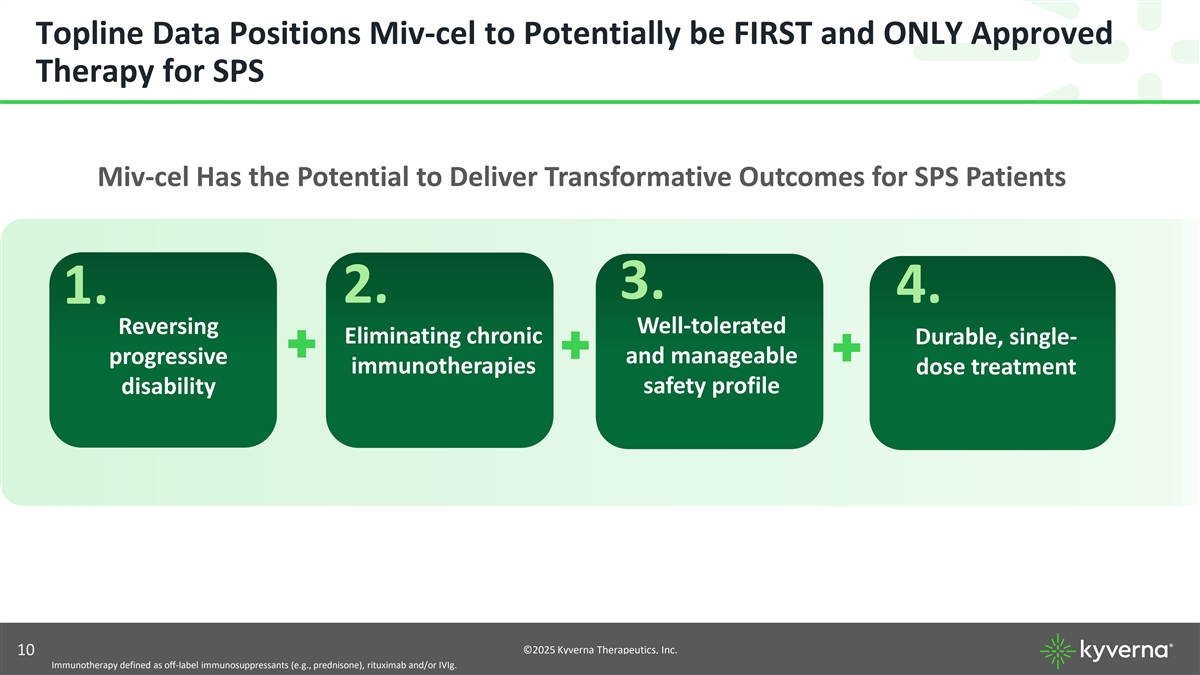 Miv-cel: Unique CAR Designed for Potency & Tolerability in Autoimmune Diseases 1,2 Mivocabtagene Autoleucel (miv-cel) • More than 100 patients dosed with Fully Human Autologous CD19 CAR T 3 miv-cel across multiple indications With CD28 Costim • Observed deep and broad depletion of 4,5 peripheral- and tissue-resident B cells Anti-CD19 scFv • First SPS and gMG patients treated with a CD8α Hinge single dose of miv-cel achieved durable efficacy beyond 24 months without the CD8α TM 6 need for background therapies CD28 Costim• No high-grade CRS or ICANS have been 3 observed CD3ζ CAR, chimeric antigen receptor; CRS, cytokine release syndrome; gMG, generalized myasthenia gravis; ICANS, immune effector cell-associated neurotoxicity syndrome; TM, transmembrane. ©2025 Kyverna Therapeutics, Inc. 9 1. Brudno JN, et al. Nat Med. 2020;26:270-280. 2. Alabanza L, et al. Mol Ther. 2017;25:2452-2465. 3.Data on file, Kyverna Therapeutics. 4. Minopoulou I, et al. Ann Rheum Dis.2025;84(3):e4-e7. 5. Albach FN, et al. Rheumatology. 2025;64(6):4075-4077. 6. Named patient access data, Kyverna Therapeutics.