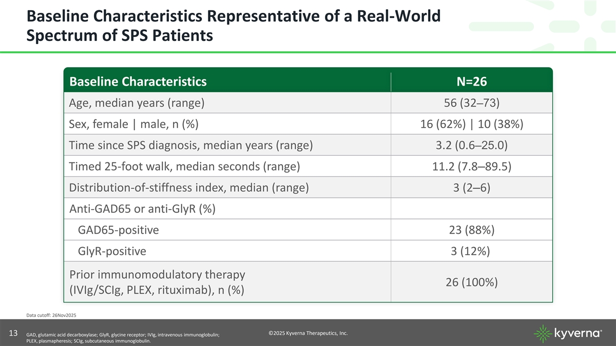 Baseline Characteristics Representative of a Real-World Spectrum of SPS Patients Baseline Characteristics N=26 Age, median years (range) 56 (32–73) Sex, female | male, n (%) 16 (62%) | 10 (38%) Time since SPS diagnosis, median years (range) 3.2 (0.6–25.0) Timed 25-foot walk, median seconds (range) 11.2 (7.8–89.5) Distribution-of-stiffness index, median (range) 3 (2–6) Anti-GAD65 or anti-GlyR (%) GAD65-positive 23 (88%) GlyR-positive 3 (12%) Prior immunomodulatory therapy 26 (100%) (IVIg/SCIg, PLEX, rituximab), n (%) Data cutoff: 26Nov2025 ©2025 Kyverna Therapeutics, Inc. 13 GAD, glutamic acid decarboxylase; GlyR, glycine receptor; IVIg, intravenous immunoglobulin; PLEX, plasmapheresis; SCIg, subcutaneous immunoglobulin.