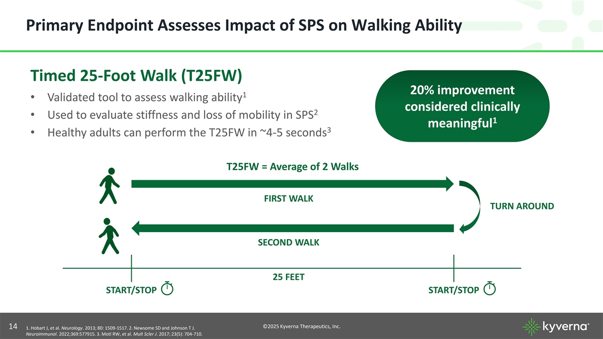 Primary Endpoint Assesses Impact of SPS on Walking Ability Timed 25-Foot Walk (T25FW) 20% improvement 1 • Validated tool to assess walking ability considered clinically 2 • Used to evaluate stiffness and loss of mobility in SPS 1 meaningful 3 • Healthy adults can perform the T25FW in ~4-5 seconds T25FW = Average of 2 Walks FIRST WALK TURN AROUND SECOND WALK 25 FEET START/STOP START/STOP ©2025 Kyverna Therapeutics, Inc. 14 1. Hobart J, et al. Neurology. 2013; 80: 1509-1517. 2. Newsome SD and Johnson T J. Neuroimmunol. 2022;369:577915. 3. Motl RW, et al. Mult Scler J. 2017; 23(5): 704-710.
