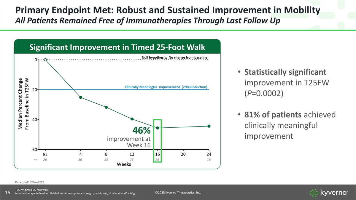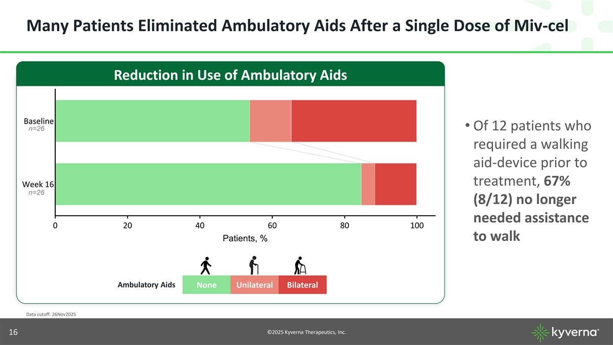 Primary Endpoint Met: Robust and Sustained Improvement in Mobility All Patients Remained Free of Immunotherapies Through Last Follow Up Significant Improvement in Timed 25-Foot Walk • Statistically significant improvement in T25FW (P=0.0002) • 81% of patients achieved clinically meaningful 46% improvement improvement at Week 16 Data cutoff: 26Nov2025 T25FW, timed 25-foot walk. ©2025 Kyverna Therapeutics, Inc. 15 Immunotherapy defined as off-label immunosuppressants (e.g., prednisone), rituximab and/or IVIg.
