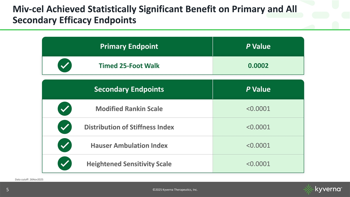 Kyverna’s Leadership in Autoimmune CAR T: Miv-cel’s Transformative Impact in SPS SPS is a debilitating, progressive autoimmune disease with no FDA-approved therapies and significant unmet medical need Miv-cel achieved statistically significant clinical benefit across all primary and secondary endpoints, reversing disability scores; patients remained free of immunotherapies as of last follow up; data supports BLA submission expected in 1H 2026 FIRST completed registration-enabling CAR T trial for autoimmune disease could pave the way for miv-cel to become the FIRST and ONLY approved therapy in SPS and CAR T-cell therapy for autoimmune disease Valuable commercial opportunity in SPS, supported by attractive market dynamics and focused commercialization strategy First-to-market opportunity in SPS lays foundation for expansion into broader indications ©2025 Kyverna Therapeutics, Inc. 4 CAR, chimeric antigen receptor.