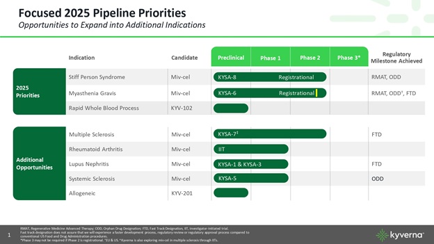 The KYSA-6 Phase 2 trial in MG was amended into a registrational Phase 2/3 trial following an end-of-Phase 2 meeting with the FDA in early 2025. In October 2025, we presented positive interim data from the Phase 2 portion of the registrational KYSA-6 clinical trial of miv-cel in MG at the American Association of Neuromuscular and Electrodiagnostic Medicine (AANEM) Annual Meeting. We expect to initiate patient enrollment in the Phase 3 portion of this trial by the end of 2025 and share updated data on the Phase 2 portion of the trial in 2026. The Phase 3 portion of the trial is expected to include 60 patients. We previously received Regenerative Medicine Advanced Therapy, or RMAT, designations and Orphan Drug Designations from the FDA for both SPS and MG as well as Orphan Drug Designation from the European Medicines Association in MG.