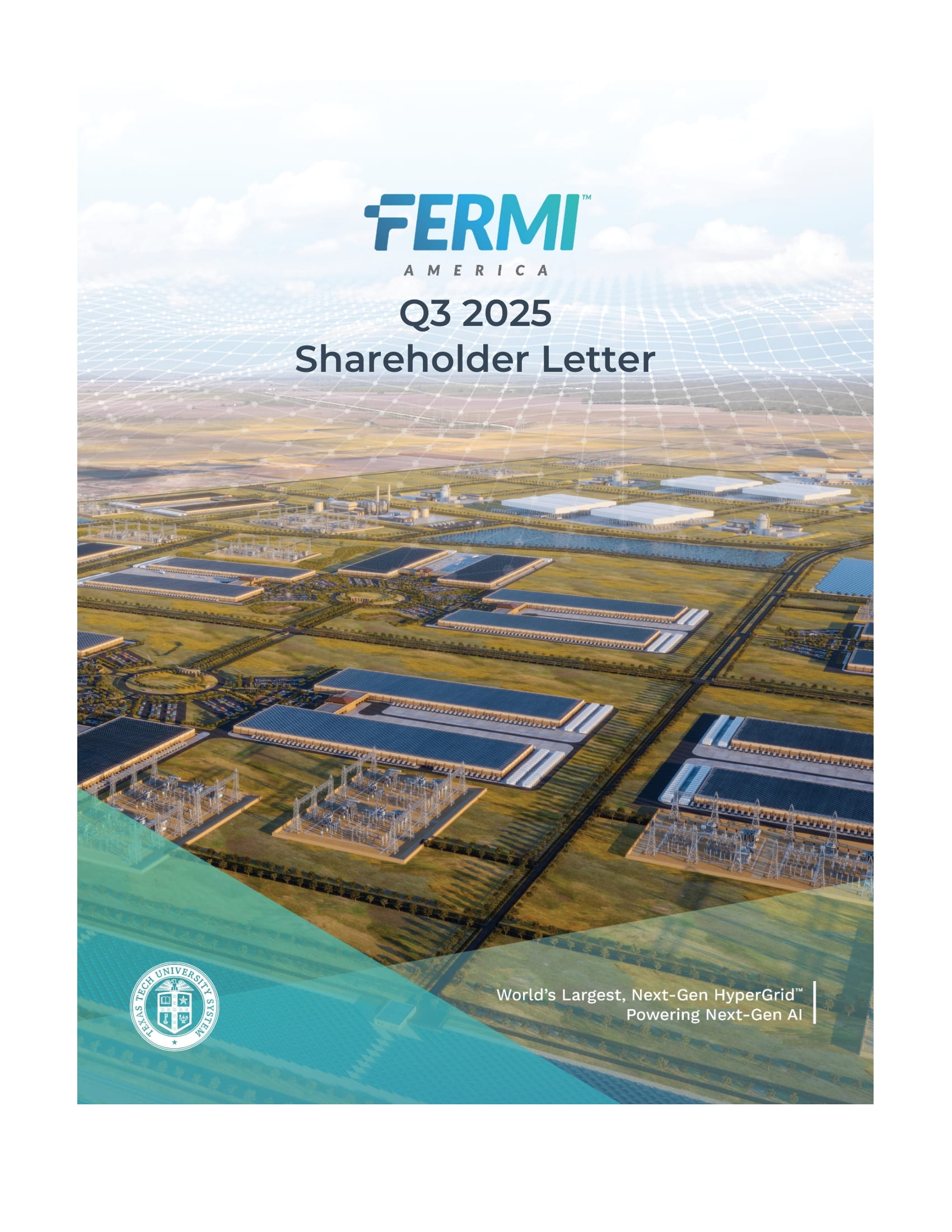 Q3 2025 Fermi America Shareholder Letter Introduction Throughout the fall of 2025 , Fermi America reached several important milestones as we build what we believe will be the world’s largest private grid in the Texas Panhandle, dedicated to supporting next - generation artificial intelligence at scale . In the months following our founding in January 2025 , we moved at an unmatched velocity to advance this ambitious project, ensuring that America remains energy and AI dominant . During the third quarter, we forged critical strategic partnerships, commenced on - site development and construction work, and laid the foundation for our initial public offering . On October 1 , 2025 , just after quarter - end, Fermi began trading as a public company, raising significant capital to accelerate our mission and positioning us to continue executing our plan to power the future of AI . Despite unfathomable progress, with the release of our first quarterly update as a public company, we’re once again reminded of the privilege and responsibility to deliver on promises made . There are no shortcuts to meeting the massive energy needs of advanced AI with clean, reliable power . Our project requires American exceptionalism, innovation, and global allied partnerships to meet the need on time and on budget . Thankfully, we have and continue to attract exactly the right team members and partners who possess the expertise, mindset, and work ethic required for this incredible project . Our momentum stems from the relentless effort of our employees who have worked 17 - hour days, 6 days a week, for months, engineering and construction partners who have placed us at the front of the line, and the Texas Panhandle community that has embraced the project and supported us with water needs and abatement 620 S. Taylor St., Suite 301 Amarillo, TX | FermiAmerica.com 3