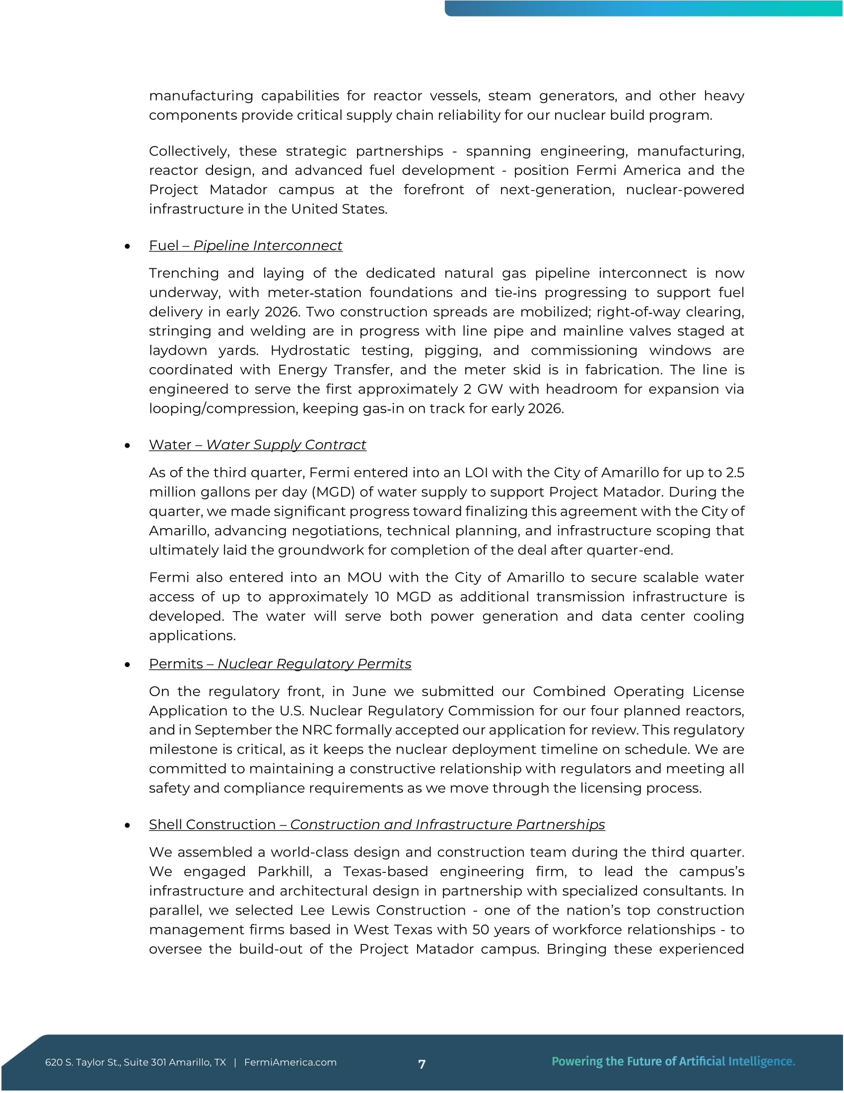 manufacturing capabilities for reactor vessels, steam generators, and other heavy components provide critical supply chain reliability for our nuclear build program . Collectively, these strategic partnerships - spanning engineering, manufacturing, reactor design, and advanced fuel development - position Fermi America and the Project Matador campus at the forefront of next - generation, nuclear - powered infrastructure in the United States . Fuel – Pipeline Interconnect Trenching and laying of the dedicated natural gas pipeline interconnect is now underway, with meter - station foundations and tie - ins progressing to support fuel delivery in early 2026 . Two construction spreads are mobilized ; right - of - way clearing, stringing and welding are in progress with line pipe and mainline valves staged at laydown yards . Hydrostatic testing, pigging, and commissioning windows are coordinated with Energy Transfer, and the meter skid is in fabrication . The line is engineered to serve the first approximately 2 GW with headroom for expansion via looping/compression, keeping gas - in on track for early 2026 . Water – Water Supply Contract As of the third quarter, Fermi entered into an LOI with the City of Amarillo for up to 2 . 5 million gallons per day (MGD) of water supply to support Project Matador . During the quarter, we made significant progress toward finalizing this agreement with the City of Amarillo, advancing negotiations, technical planning, and infrastructure scoping that ultimately laid the groundwork for completion of the deal after quarter - end . Fermi also entered into an MOU with the City of Amarillo to secure scalable water access of up to approximately 10 MGD as additional transmission infrastructure is developed . The water will serve both power generation and data center cooling applications . Permits – Nuclear Regulatory Permits On the regulatory front, in June we submitted our Combined Operating License Application to the U . S . Nuclear Regulatory Commission for our four planned reactors, and in September the NRC formally accepted our application for review . This regulatory milestone is critical, as it keeps the nuclear deployment timeline on schedule . We are committed to maintaining a constructive relationship with regulators and meeting all safety and compliance requirements as we move through the licensing process . Shell Construction – Construction and Infrastructure Partnerships We assembled a world - class design and construction team during the third quarter . We engaged Parkhill, a Texas - based engineering firm, to lead the campus’s infrastructure and architectural design in partnership with specialized consultants . In parallel, we selected Lee Lewis Construction - one of the nation’s top construction management firms based in West Texas with 50 years of workforce relationships - to oversee the build - out of the Project Matador campus . Bringing these experienced 620 S. Taylor St., Suite 301 Amarillo, TX | FermiAmerica.com 7
