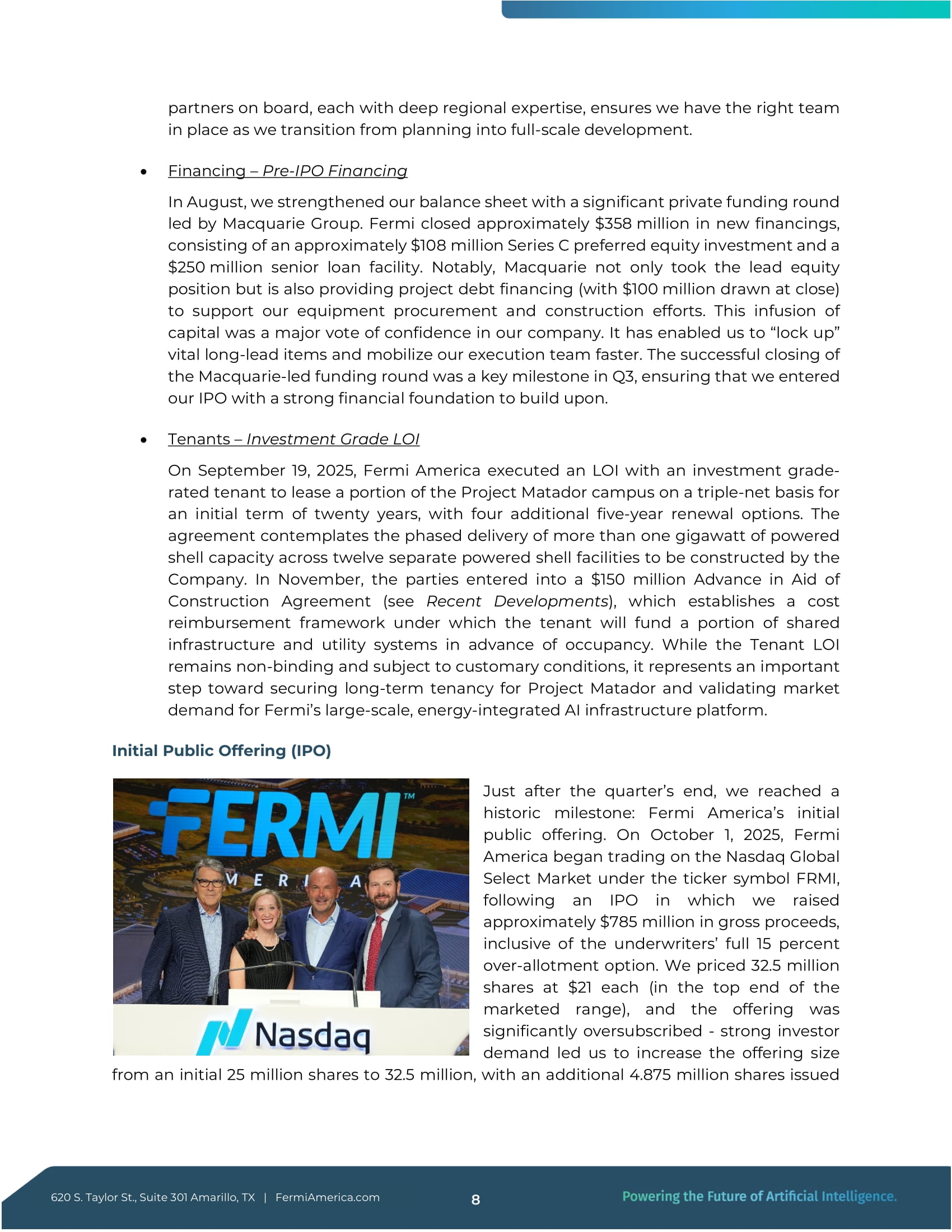 partners on board, each with deep regional expertise, ensures we have the right team in place as we transition from planning into full - scale development . Financing – Pre - IPO Financing In August, we strengthened our balance sheet with a significant private funding round led by Macquarie Group . Fermi closed approximately $ 358 million in new financings, consisting of an approximately $ 108 million Series C preferred equity investment and a $ 250 million senior loan facility . Notably, Macquarie not only took the lead equity position but is also providing project debt financing (with $ 100 million drawn at close) to support our equipment procurement and construction efforts . This infusion of capital was a major vote of confidence in our company . It has enabled us to “lock up” vital long - lead items and mobilize our execution team faster . The successful closing of the Macquarie - led funding round was a key milestone in Q 3 , ensuring that we entered our IPO with a strong financial foundation to build upon . Tenants – Investment Grade LOI On September 19 , 2025 , Fermi America executed an LOI with an investment grade - rated tenant to lease a portion of the Project Matador campus on a triple - net basis for an initial term of twenty years, with four additional five - year renewal options . The agreement contemplates the phased delivery of more than one gigawatt of powered shell capacity across twelve separate powered shell facilities to be constructed by the Company . In November, the parties entered into a $ 150 million Advance in Aid of Construction Agreement (see Recent Developments ), which establishes a cost reimbursement framework under which the tenant will fund a portion of shared infrastructure and utility systems in advance of occupancy . While the Tenant LOI remains non - binding and subject to customary conditions, it represents an important step toward securing long - term tenancy for Project Matador and validating market demand for Fermi’s large - scale, energy - integrated AI infrastructure platform . Initial Public Offering (IPO) Just after the quarter’s end, we reached a historic milestone : Fermi America’s initial public offering . On October 1 , 2025 , Fermi America began trading on the Nasdaq Global Select Market under the ticker symbol FRMI, following an IPO in which we raised approximately $ 785 million in gross proceeds, inclusive of the underwriters’ full 15 percent over - allotment option . We priced 32 . 5 million shares at $ 21 each (in the top end of the marketed range), and the offering was significantly oversubscribed - strong investor demand led us to increase the offering size from an initial 25 million shares to 32 . 5 million, with an additional 4 . 875 million shares issued 620 S. Taylor St., Suite 301 Amarillo, TX | FermiAmerica.com 8
