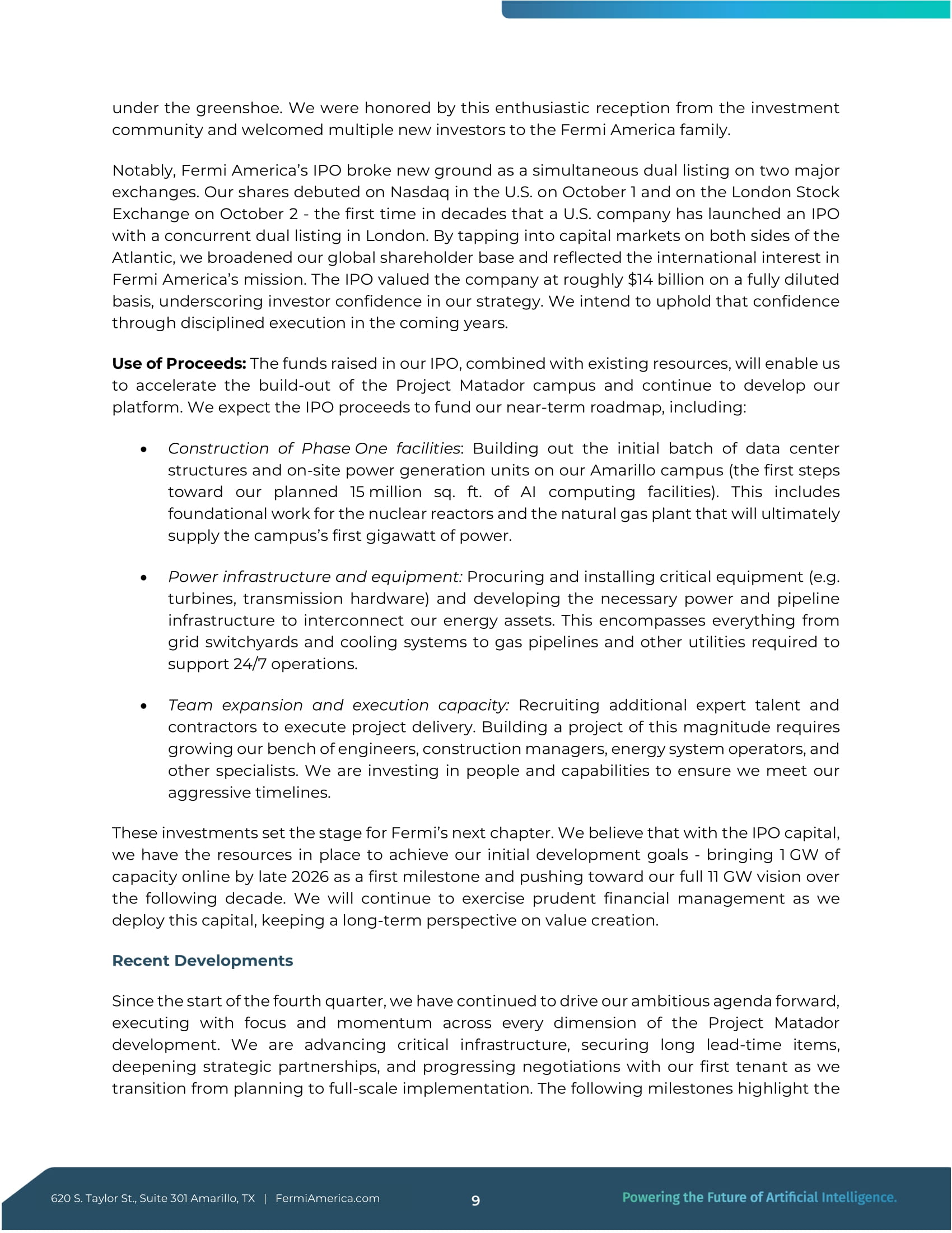 under the greenshoe . We were honored by this enthusiastic reception from the investment community and welcomed multiple new investors to the Fermi America family . Notably, Fermi America’s IPO broke new ground as a simultaneous dual listing on two major exchanges . Our shares debuted on Nasdaq in the U . S . on October 1 and on the London Stock Exchange on October 2 - the first time in decades that a U . S . company has launched an IPO with a concurrent dual listing in London . By tapping into capital markets on both sides of the Atlantic, we broadened our global shareholder base and reflected the international interest in Fermi America’s mission . The IPO valued the company at roughly $ 14 billion on a fully diluted basis, underscoring investor confidence in our strategy . We intend to uphold that confidence through disciplined execution in the coming years . Use of Proceeds : The funds raised in our IPO, combined with existing resources, will enable us to accelerate the build - out of the Project Matador campus and continue to develop our platform . We expect the IPO proceeds to fund our near - term roadmap, including : Construction of Phase One facilities : Building out the initial batch of data center structures and on - site power generation units on our Amarillo campus (the first steps toward our planned 15 million sq . ft . of AI computing facilities) . This includes foundational work for the nuclear reactors and the natural gas plant that will ultimately supply the campus’s first gigawatt of power . Power infrastructure and equipment : Procuring and installing critical equipment (e . g . turbines, transmission hardware) and developing the necessary power and pipeline infrastructure to interconnect our energy assets . This encompasses everything from grid switchyards and cooling systems to gas pipelines and other utilities required to support 24 / 7 operations . Team expansion and execution capacity : Recruiting additional expert talent and contractors to execute project delivery . Building a project of this magnitude requires growing our bench of engineers, construction managers, energy system operators, and other specialists . We are investing in people and capabilities to ensure we meet our aggressive timelines . These investments set the stage for Fermi’s next chapter . We believe that with the IPO capital, we have the resources in place to achieve our initial development goals - bringing 1 GW of capacity online by late 2026 as a first milestone and pushing toward our full 11 GW vision over the following decade . We will continue to exercise prudent financial management as we deploy this capital, keeping a long - term perspective on value creation . Recent Developments Since the start of the fourth quarter, we have continued to drive our ambitious agenda forward, executing with focus and momentum across every dimension of the Project Matador development . We are advancing critical infrastructure, securing long lead - time items, deepening strategic partnerships, and progressing negotiations with our first tenant as we transition from planning to full - scale implementation . The following milestones highlight the 620 S. Taylor St., Suite 301 Amarillo, TX | FermiAmerica.com 9