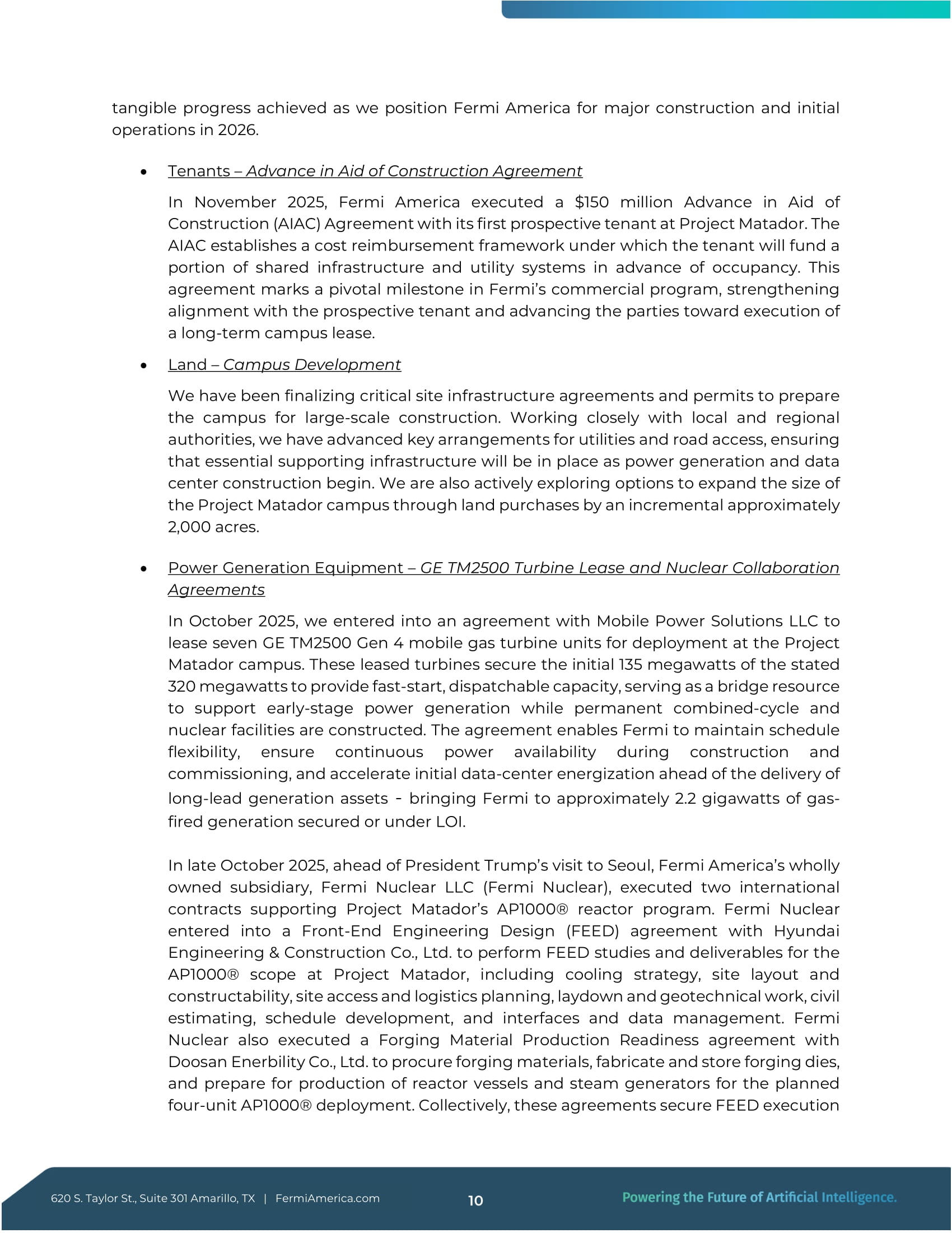 tangible progress achieved as we position Fermi America for major construction and initial operations in 2026. Tenants – Advance in Aid of Construction Agreement In November 2025 , Fermi America executed a $ 150 million Advance in Aid of Construction (AIAC) Agreement with its first prospective tenant at Project Matador . The AIAC establishes a cost reimbursement framework under which the tenant will fund a portion of shared infrastructure and utility systems in advance of occupancy . This agreement marks a pivotal milestone in Fermi’s commercial program, strengthening alignment with the prospective tenant and advancing the parties toward execution of a long - term campus lease . Land – Campus Development We have been finalizing critical site infrastructure agreements and permits to prepare the campus for large - scale construction . Working closely with local and regional authorities, we have advanced key arrangements for utilities and road access, ensuring that essential supporting infrastructure will be in place as power generation and data center construction begin . We are also actively exploring options to expand the size of the Project Matador campus through land purchases by an incremental approximately 2 , 000 acres . Power Generation Equipment – GE TM 2500 Turbine Lease and Nuclear Collaboration Agreements In October 2025 , we entered into an agreement with Mobile Power Solutions LLC to lease seven GE TM 2500 Gen 4 mobile gas turbine units for deployment at the Project Matador campus . These leased turbines secure the initial 135 megawatts of the stated 320 megawatts to provide fast - start, dispatchable capacity, serving as a bridge resource to support early - stage power generation while permanent combined - cycle and nuclear facilities are constructed . The agreement enables Fermi to maintain schedule flexibility, ensure continuous power availability during construction and commissioning, and accelerate initial data - center energization ahead of the delivery of long - lead generation assets - bringing Fermi to approximately 2 . 2 gigawatts of gas - fired generation secured or under LOI . In late October 2025 , ahead of President Trump’s visit to Seoul, Fermi America’s wholly owned subsidiary, Fermi Nuclear LLC (Fermi Nuclear), executed two international contracts supporting Project Matador’s AP 1000 ® reactor program . Fermi Nuclear entered into a Front - End Engineering Design (FEED) agreement with Hyundai Engineering & Construction Co . , Ltd . to perform FEED studies and deliverables for the AP 1000 ® scope at Project Matador, including cooling strategy, site layout and constructability, site access and logistics planning, laydown and geotechnical work, civil estimating, schedule development, and interfaces and data management . Fermi Nuclear also executed a Forging Material Production Readiness agreement with Doosan Enerbility Co . , Ltd . to procure forging materials, fabricate and store forging dies, and prepare for production of reactor vessels and steam generators for the planned four - unit AP 1000 ® deployment . Collectively, these agreements secure FEED execution 620 S. Taylor St., Suite 301 Amarillo, TX | FermiAmerica.com 10