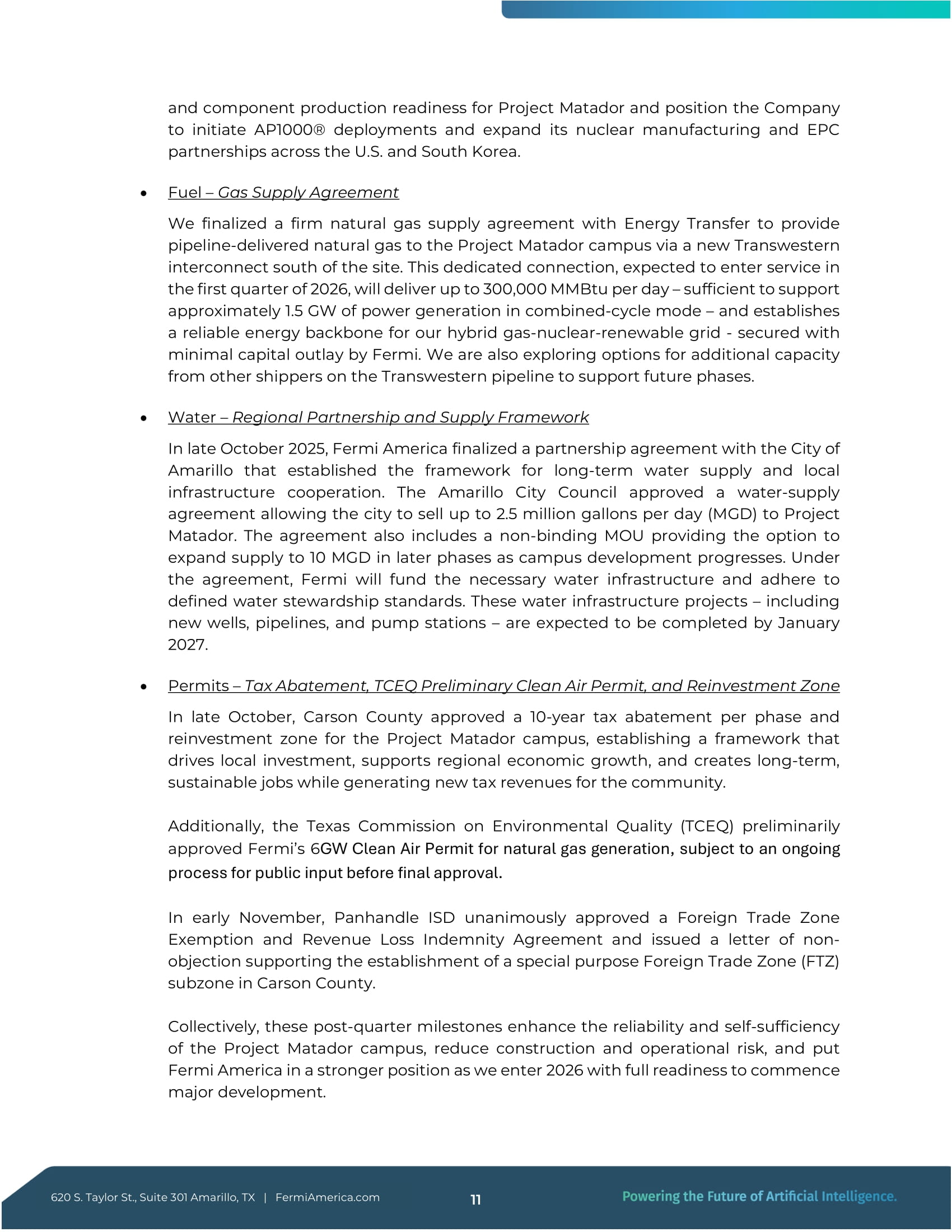 and component production readiness for Project Matador and position the Company to initiate AP 1000 ® deployments and expand its nuclear manufacturing and EPC partnerships across the U . S . and South Korea . Fuel – Gas Supply Agreement We finalized a firm natural gas supply agreement with Energy Transfer to provide pipeline - delivered natural gas to the Project Matador campus via a new Transwestern interconnect south of the site . This dedicated connection, expected to enter service in the first quarter of 2026 , will deliver up to 300 , 000 MMBtu per day – sufficient to support approximately 1 . 5 GW of power generation in combined - cycle mode – and establishes a reliable energy backbone for our hybrid gas - nuclear - renewable grid - secured with minimal capital outlay by Fermi . We are also exploring options for additional capacity from other shippers on the Transwestern pipeline to support future phases . Water – Regional Partnership and Supply Framework In late October 2025 , Fermi America finalized a partnership agreement with the City of Amarillo that established the framework for long - term water supply and local infrastructure cooperation . The Amarillo City Council approved a water - supply agreement allowing the city to sell up to 2 . 5 million gallons per day (MGD) to Project Matador . The agreement also includes a non - binding MOU providing the option to expand supply to 10 MGD in later phases as campus development progresses . Under the agreement, Fermi will fund the necessary water infrastructure and adhere to defined water stewardship standards . These water infrastructure projects – including new wells, pipelines, and pump stations – are expected to be completed by January 2027 . Permits – Tax Abatement, TCEQ Preliminary Clean Air Permit, and Reinvestment Zone In late October, Carson County approved a 10 - year tax abatement per phase and reinvestment zone for the Project Matador campus, establishing a framework that drives local investment, supports regional economic growth, and creates long - term, sustainable jobs while generating new tax revenues for the community . Additionally, the Texas Commission on Environmental Quality (TCEQ) preliminarily approved Fermi’s 6 GW Clean Air Permit for natural gas generation, subject to an ongoing process for public input before final approval . In early November, Panhandle ISD unanimously approved a Foreign Trade Zone Exemption and Revenue Loss Indemnity Agreement and issued a letter of non - objection supporting the establishment of a special purpose Foreign Trade Zone (FTZ) subzone in Carson County . Collectively, these post - quarter milestones enhance the reliability and self - sufficiency of the Project Matador campus, reduce construction and operational risk, and put Fermi America in a stronger position as we enter 2026 with full readiness to commence major development . 620 S. Taylor St., Suite 301 Amarillo, TX | FermiAmerica.com 11