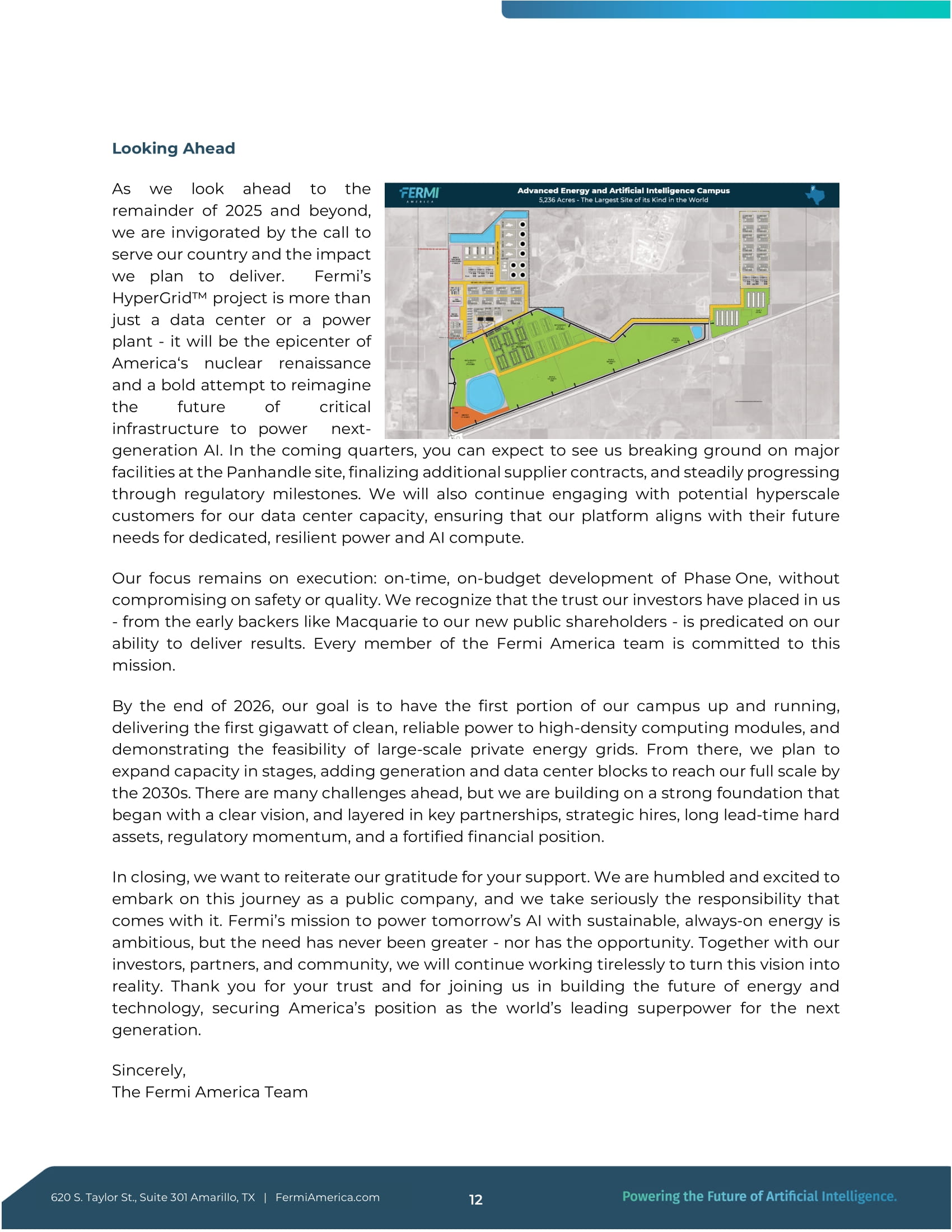 Looking Ahead As we look ahead to the remainder of 2025 and beyond, we are invigorated by the call to serve our country and the impact we plan to deliver . Fermi’s HyperGrid project is more than just a data center or a power plant - it will be the epicenter of America‘s nuclear renaissance and a bold attempt to reimagine the future of critical infrastructure to power next - generation AI . In the coming quarters, you can expect to see us breaking ground on major facilities at the Panhandle site, finalizing additional supplier contracts, and steadily progressing through regulatory milestones . We will also continue engaging with potential hyperscale customers for our data center capacity, ensuring that our platform aligns with their future needs for dedicated, resilient power and AI compute . Our focus remains on execution : on - time, on - budget development of Phase One, without compromising on safety or quality . We recognize that the trust our investors have placed in us - from the early backers like Macquarie to our new public shareholders - is predicated on our ability to deliver results . Every member of the Fermi America team is committed to this mission . By the end of 2026 , our goal is to have the first portion of our campus up and running, delivering the first gigawatt of clean, reliable power to high - density computing modules, and demonstrating the feasibility of large - scale private energy grids . From there, we plan to expand capacity in stages, adding generation and data center blocks to reach our full scale by the 2030 s . There are many challenges ahead, but we are building on a strong foundation that began with a clear vision, and layered in key partnerships, strategic hires, long lead - time hard assets, regulatory momentum, and a fortified financial position . In closing, we want to reiterate our gratitude for your support . We are humbled and excited to embark on this journey as a public company, and we take seriously the responsibility that comes with it . Fermi’s mission to power tomorrow’s AI with sustainable, always - on energy is ambitious, but the need has never been greater - nor has the opportunity . Together with our investors, partners, and community, we will continue working tirelessly to turn this vision into reality . Thank you for your trust and for joining us in building the future of energy and technology, securing America’s position as the world’s leading superpower for the next generation . Sincerely, The Fermi America Team 620 S. Taylor St., Suite 301 Amarillo, TX | FermiAmerica.com 12