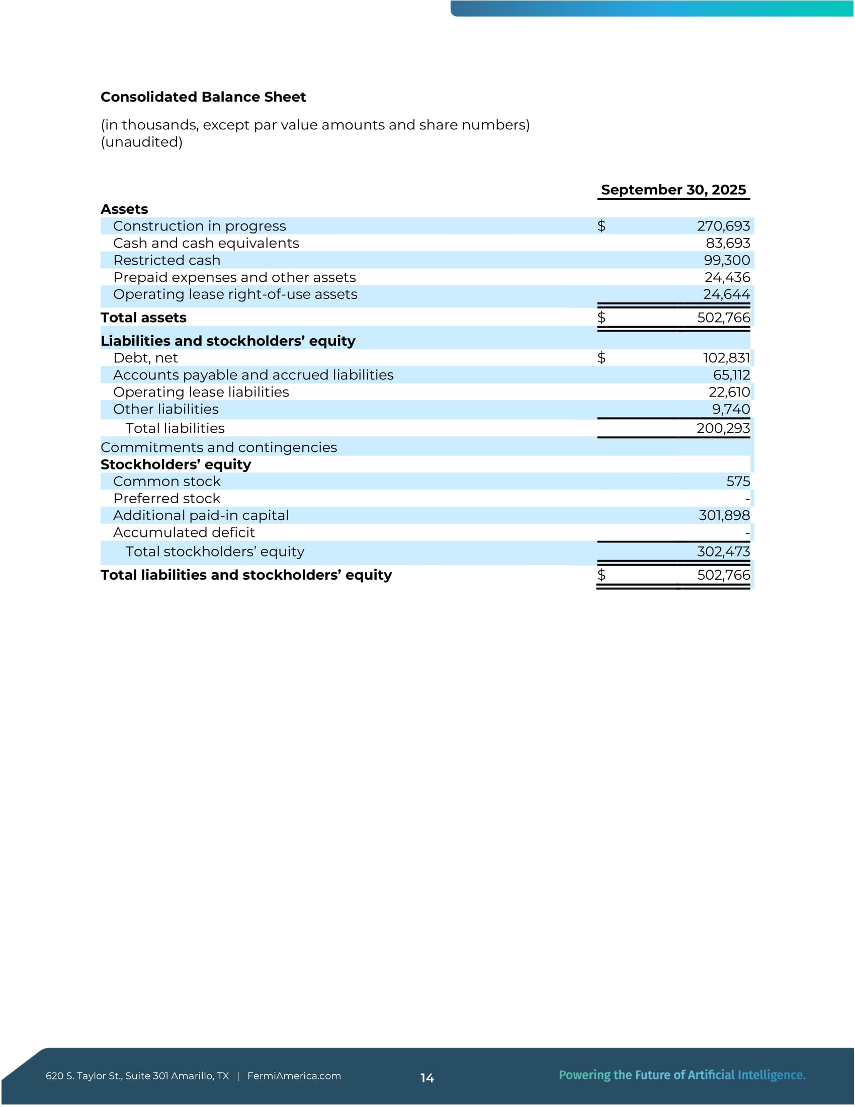 Q3 2025 Financial Highlights 620 S. Taylor St., Suite 301 Amarillo, TX | FermiAmerica.com 13 Year - to - Date September 30, 2025 GAAP Results $8.3M Cash used in operating activities Year - to - date cash used in operating activities was $ 8 . 3 million . The period reflects a net loss of $ 353 . 2 million, offset by certain non - cash charges including a $ 173 . 8 million charitable contribution of Class B Units to a donor - advised fund at Dechomai Asset Trust, a Nevada 501 (c)( 3 ) public nonprofit organization, a total of $ 111 . 6 million of fair value adjustments consisting of $ 61 . 0 million of fair value losses on our Series B Convertible Notes accounted for under the fair value option, $ 46 . 4 million of fair value losses on embedded derivative liabilities related to the Preferred Units Financing, and $ 4 . 2 million of fair value losses on embedded derivative liabilities associated with the Macquarie Term Loan, $ 28 . 4 million of share - based compensation expense, and $ 23 . 7 million of inducement expense related to the Preferred Units Financing . Working capital changes provided a net source of cash, primarily driven by a $ 10 . 8 million increase in accounts payable and accrued liabilities, partially offset by a $ 4 . 5 million use of cash for prepaid items, largely deposits and prepaid rent for the TTU Lease associated with Project Matador . $353.2M – – $0.95 per share Net loss Year - to - date net loss was $ 353 . 2 million . The loss primarily reflects non - cash charges mentioned above, including a $ 173 . 8 million charitable contribution, a total of $ 111 . 6 million of fair value losses related to Series B Convertible Notes, Preferred Units Financing and Macquarie term loan, $ 28 . 4 million of share - based compensation expense, and $ 23 . 7 million of inducement expense related to the Preferred Units Financing . Net loss included approximately $ 15 . 0 million of other general and administrative costs primarily comprised of professional services, consulting, legal, travel, staffing, and general corporate expenses incurred to support ongoing business operations and project development activities, as well as $ 0 . 7 million of net interest expense related to our convertible note financings . $183.0M Cash and cash equivalents At the end of the third quarter, cash and cash equivalents totaled $ 183 . 0 million, including $ 83 . 7 million of unrestricted cash and $ 99 . 3 million of restricted cash associated with the Macquarie Term Loan . The restricted balance reflects proceeds held in a blocked account under the loan agreement and designated solely for payments related to certain equipment purchases and associated project costs . This balance does not include the net proceeds from our initial public offering, which settled on October 2 , 2025 , and generated approximately $ 731 . 4 million in net proceeds after deducting underwriting discounts and offering expenses .