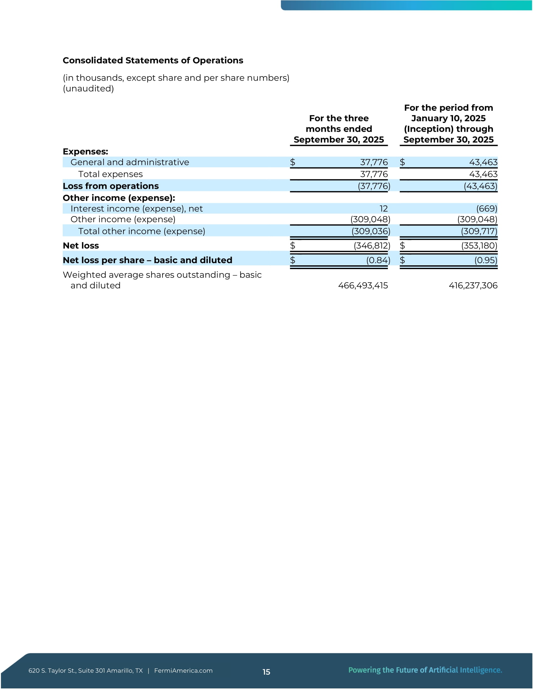 Consolidated Statements of Operations (in thousands, except share and per share numbers) (unaudited ) 620 S. Taylor St., Suite 301 Amarillo, TX | FermiAmerica.com 15 For the period from January 10, 2025 (Inception) through September 30, 2025 For the three months ended September 30, 2025 Expenses: 43,463 $ 37,776 $ General and administrative 43,463 37,776 Total expenses (43,463) ) (37,776 Loss from operations Other income (expense): (669) 12 Interest income (expense), net (309,048) ) (309,048 Other income (expense) (309,717) ) (309,036 Total other income (expense) (353,180) $ ) (346,812 $ Net loss (0.95) $ ) (0.84 $ Net loss per share – basic and diluted 416,237,306 466,493,415 Weighted average shares outstanding – basic and diluted