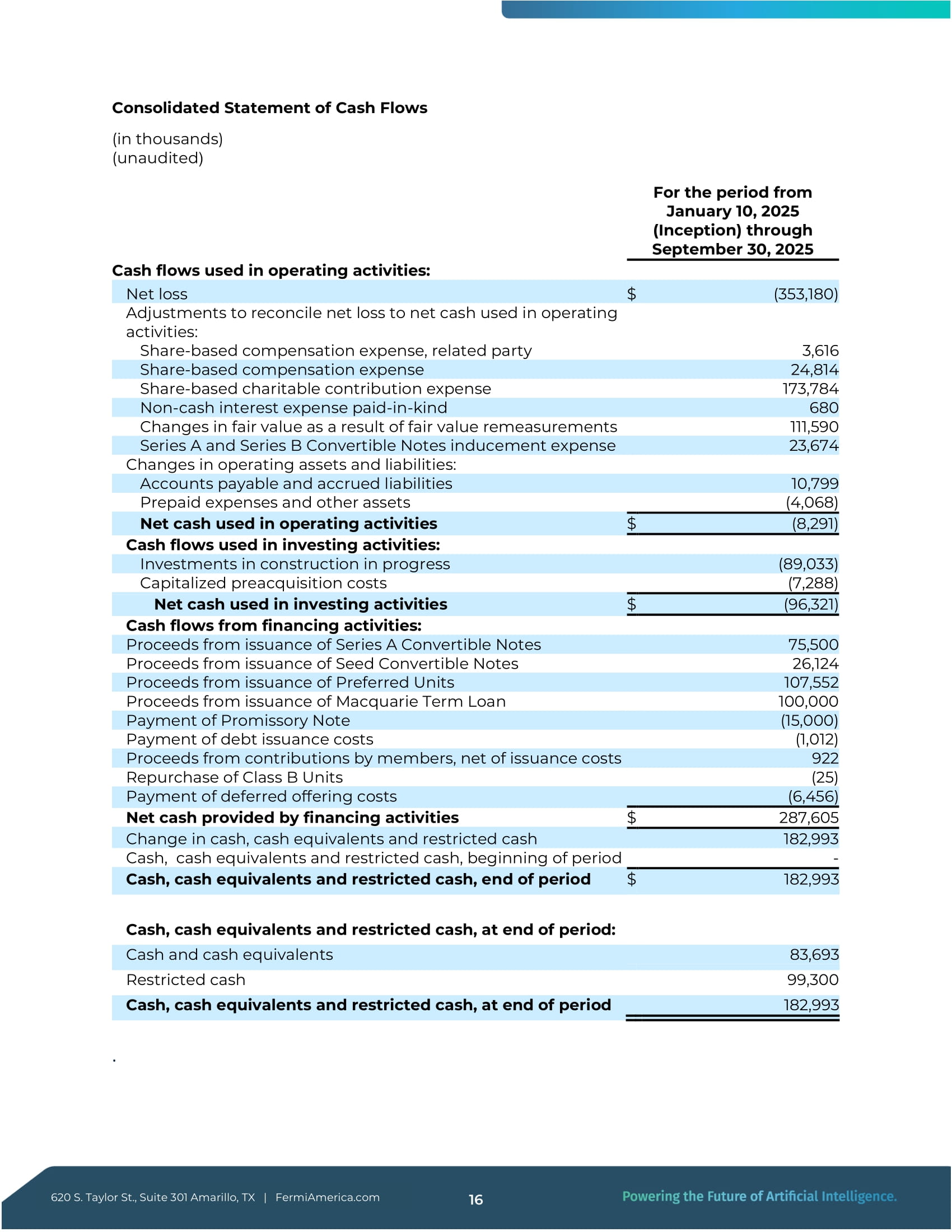 Consolidated Statement of Cash Flows (in thousands) (unaudited ) 620 S. Taylor St., Suite 301 Amarillo, TX | FermiAmerica.com 16 For the period from January 10, 2025 (Inception) through September 30, 2025 Cash flows used in operating activities: (353,180) $ Net loss Adjustments to reconcile net loss to net cash used in operating activities: 3,616 Share - based compensation expense, related party 24,814 Share - based compensation expense 173,784 Share - based charitable contribution expense 680 Non - cash interest expense paid - in - kind 111,590 Changes in fair value as a result of fair value remeasurements 23,674 Series A and Series B Convertible Notes inducement expense Changes in operating assets and liabilities: 10,799 Accounts payable and accrued liabilities (4,068) Prepaid expenses and other assets (8,291) $ Net cash used in operating activities Cash flows used in investing activities: (89,033) Investments in construction in progress (7,288) Capitalized preacquisition costs (96,321) $ Net cash used in investing activities Cash flows from financing activities: 75,500 Proceeds from issuance of Series A Convertible Notes 26,124 Proceeds from issuance of Seed Convertible Notes 107,552 Proceeds from issuance of Preferred Units 100,000 Proceeds from issuance of Macquarie Term Loan (15,000) Payment of Promissory Note (1,012) Payment of debt issuance costs 922 Proceeds from contributions by members, net of issuance costs (25) Repurchase of Class B Units (6,456) Payment of deferred offering costs 287,605 $ Net cash provided by financing activities 182,993 Change in cash, cash equivalents and restricted cash - Cash, cash equivalents and restricted cash, beginning of period 182,993 $ Cash, cash equivalents and restricted cash, end of period Cash, cash equivalents and restricted cash, at end of period: 83,693 Cash and cash equivalents 99,300 Restricted cash 182,993 Cash, cash equivalents and restricted cash, at end of period .