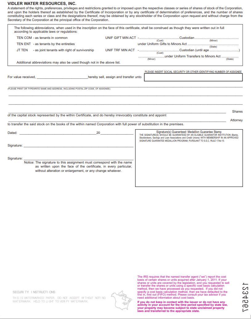 EX-4.2VIDLER WATER RESOURCES, INC. STOCK CERTIFICATE