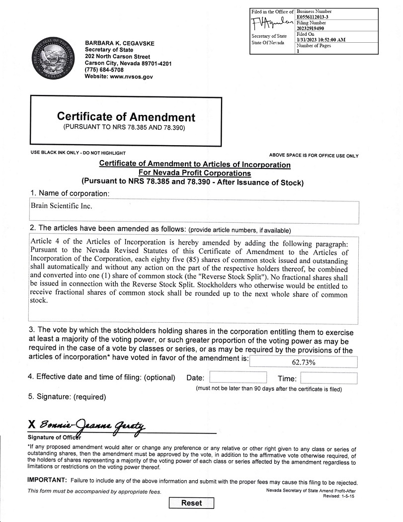 CERTIFICATE OF AMENDMENT TO CERTIFICATE OF INCORPORATION, FILED JANUARY 31, 2023