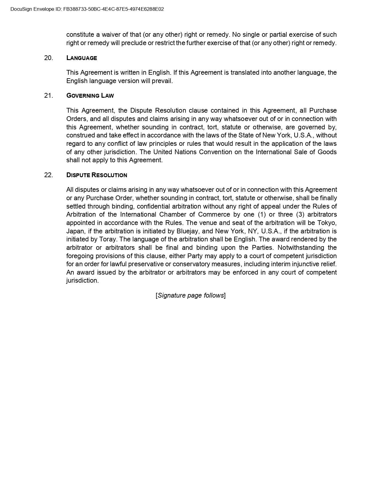 MASTER SUPPLY AGREEMENT DATED JULY 30, 2021, BETWEEN BLUEJAY DIAGNOSTICS, INC. AND SANYOSEIKO CO., LTD.