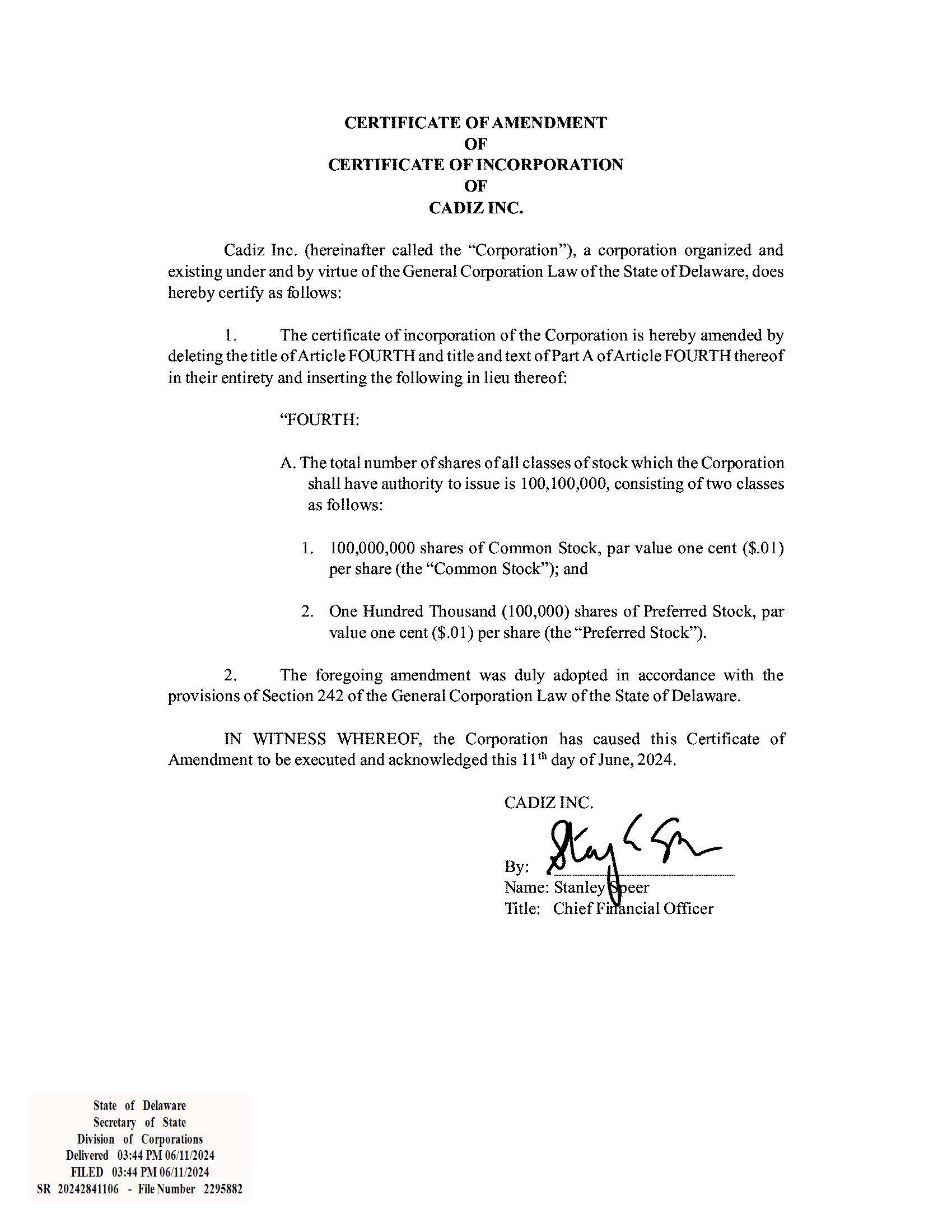 EXHIBIT 4.3 AMENDMENT TO CADIZ INC. CERTIFICATE OF INCORPORATION DATED JUNE 11, 2024