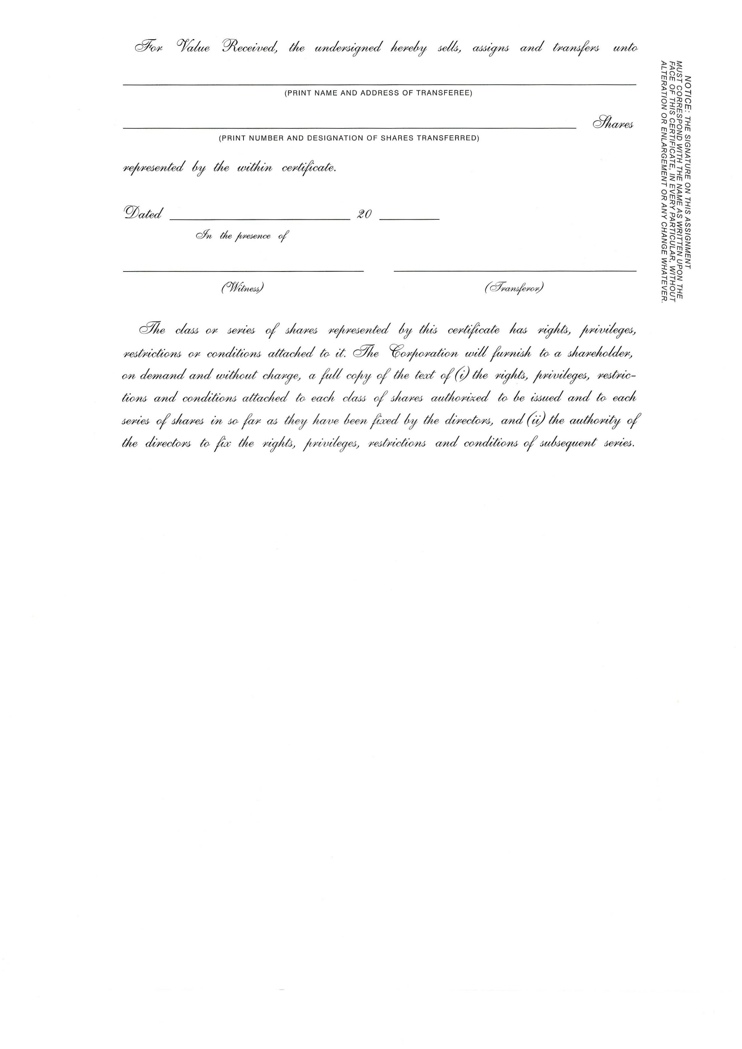 SPECIMEN COMMON SHARE CERTIFICATE OF BOREALIS FOODS INC